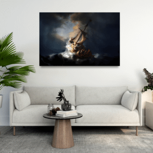 Rembrandt’ın 1633’te resmettiği Celile Denizi’ndeki Fırtına adlı eseri, onun tek deniz manzarasıdır ve İsa’nın şiddetli bir fırtınayı yatıştırdığı ve müritlerinin paniklediği İncil anını tasvir etmektedir. Yoğun ışık-gölge kullanımıyla karakterize edilen bu dramatik eser, doğanın kaosu ile İsa’nın dinginliği arasındaki karşıtlığı resmetmesiyle bilinir. 160 cm × 128 cm ölçülerindeki eser, 1990’da Isabella Stewart Gardner Müzesi’nden çalınmış ve hala kayıptır.