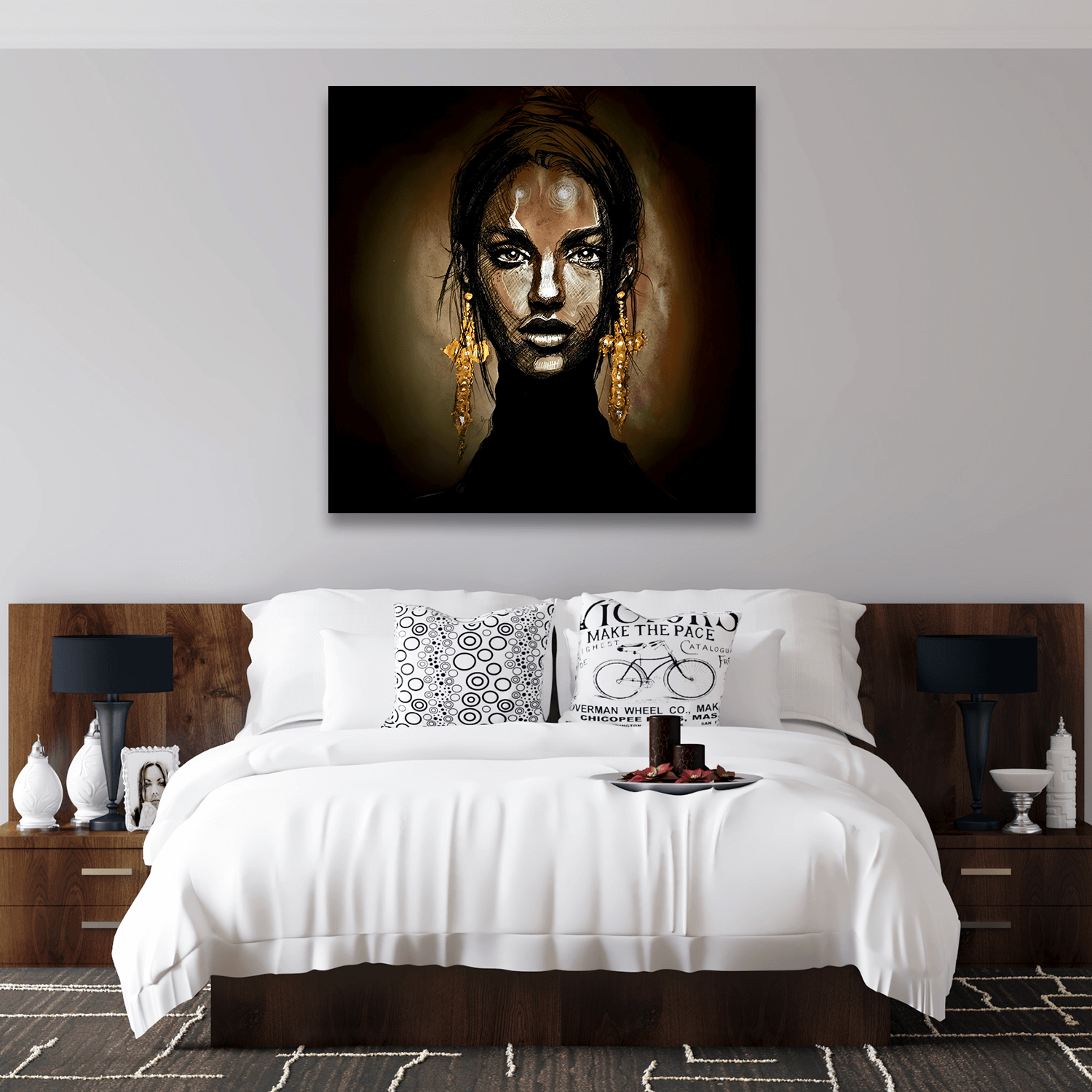 Figürün yalnızca bakmayan, gözleyen hali tabloyu kadın temalı sezgisel ve dikkat odaklı dekoratif tablolar arasında güçlü bir sembole dönüştürür.