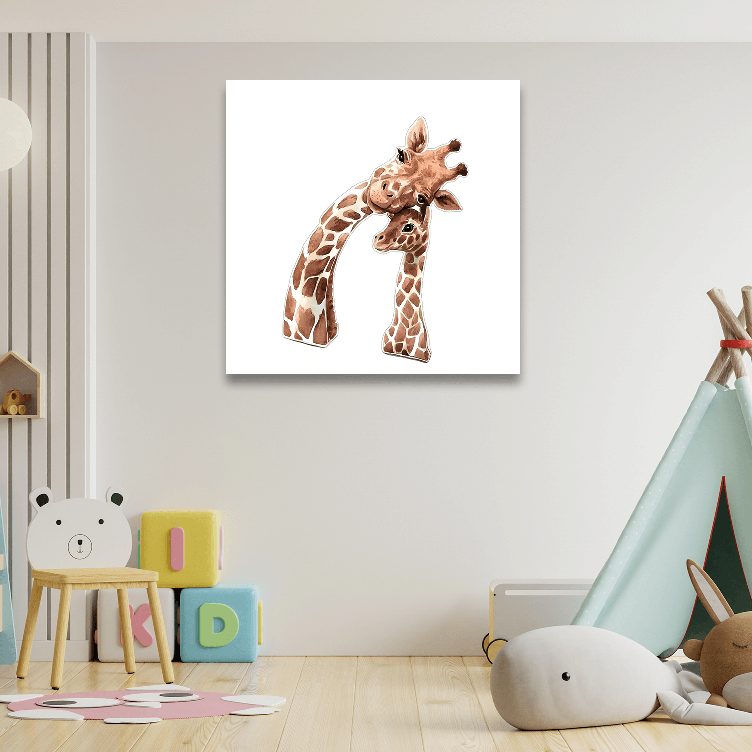 Anne ve Yavru Zürafa Aile Tablosu, sevimli ve sıcak bir aile bağını yansıtan yumuşak çizimleriyle her bakışta huzur veren bir sanat eseri. Zarif fırça darbeleriyle tasvir edilen anne ve yavru zürafa, çocuk odası dekorasyonunu tamamlayacak sıcak bir atmosfer sunar.