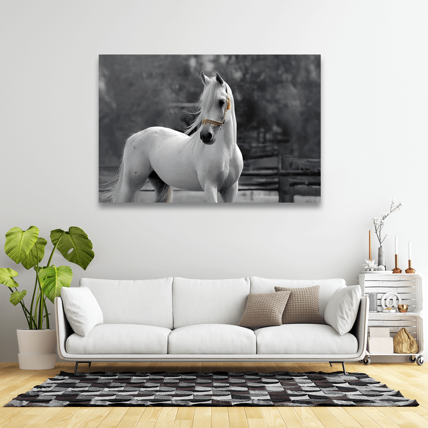 Asil duruşlu at figürü, bu tabloyu at temalı estetik duvar tabloları kategorisinde karakteri güçlü bir dekoratif parça haline getiriyor.