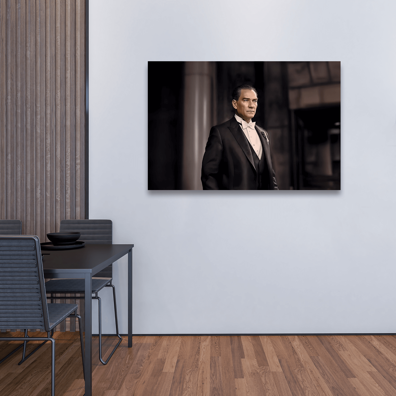 Bu tablo, salon tablosu olarak sergilendiğinde misafirlerinize Atatürk’ün zarafetini ve modern Türkiye’yi temsil eden duruşunu anımsatır. Ofis tablosu olarak kullanıldığında, çalışma ortamına disiplin ve estetik bir katkı sağlar. Yatak odası tablosu olarak tercih edildiğinde ise, her sabah kalktığınızda Atatürk’ün azmi ve zarafeti size ilham verir.