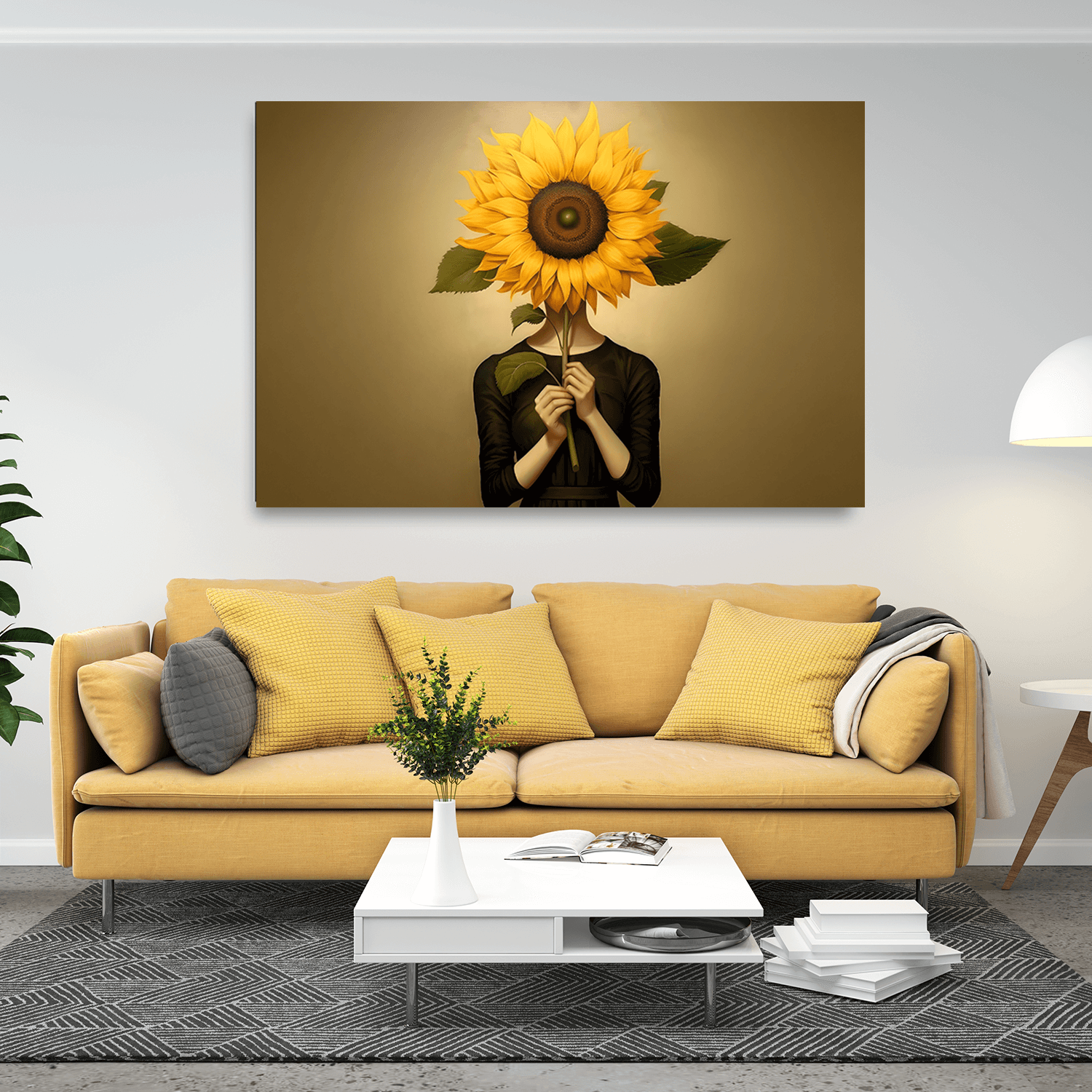“Ayçiçeğinin Ardında”, hem renkleri hem anlatımıyla duvar dekorasyonuna uygun tablolar arasında zarafeti ve içsel bir sıcaklığı yaşam alanlarınıza taşır.