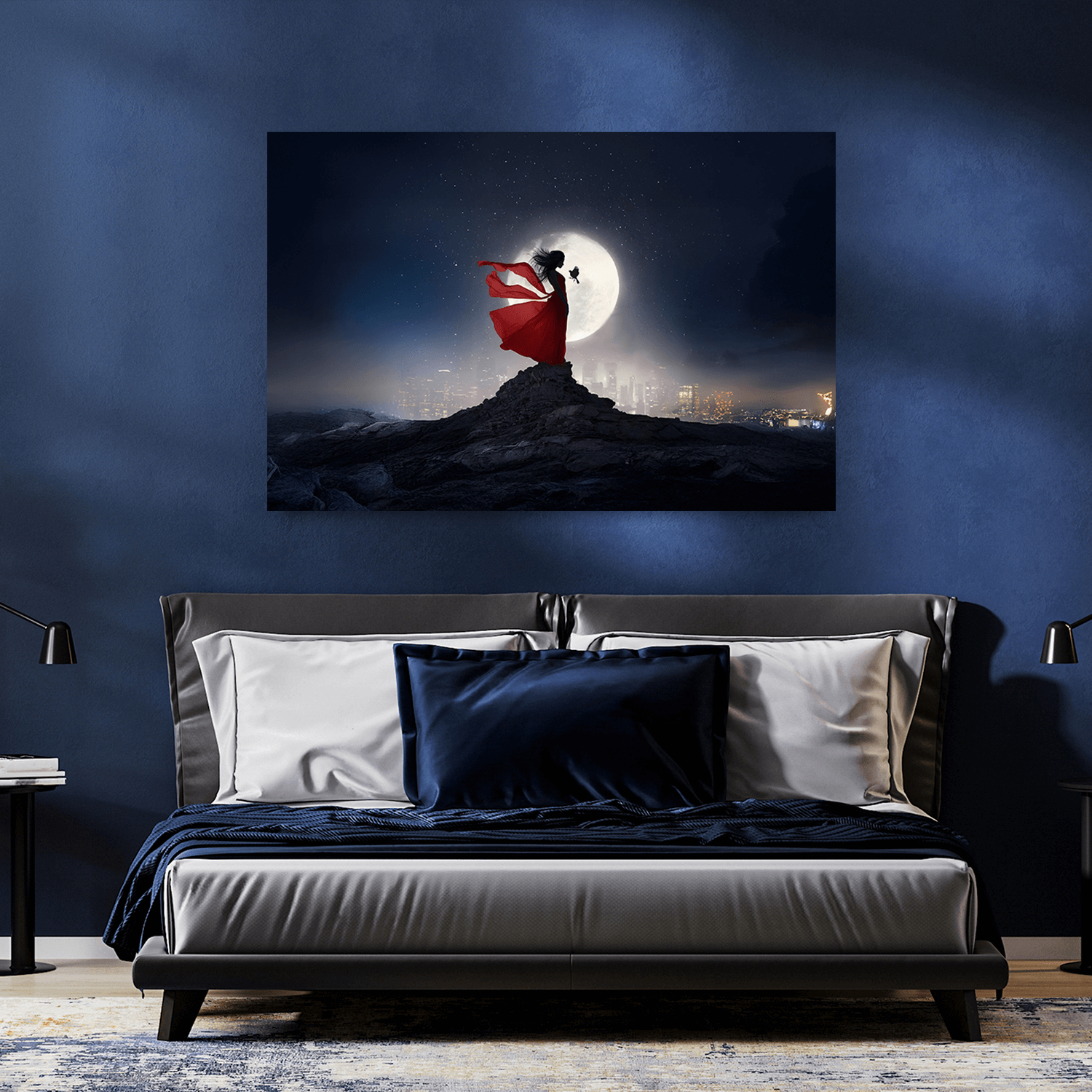 Gece ve kırmızı tonların hâkimiyetindeki bu tablo, yatak odası dekorasyonu için anlamlı tablolar arasında yer alır. Huzur, gizem ve zarif bir romantizm hissi sunarak uyumlu bir ambiyans oluşturur.