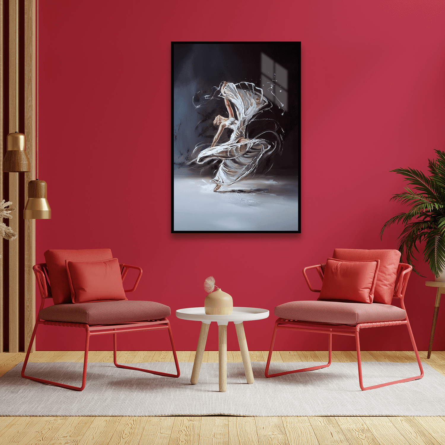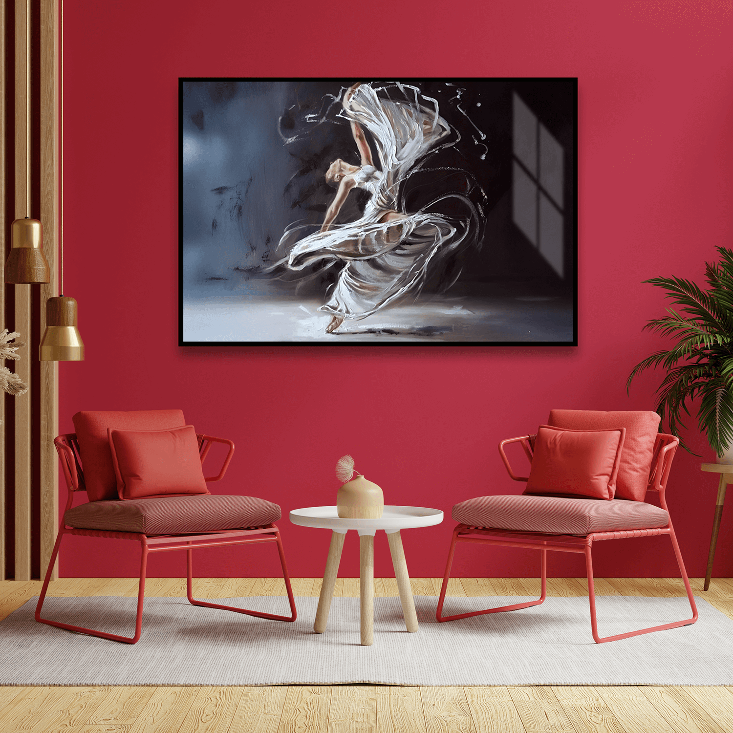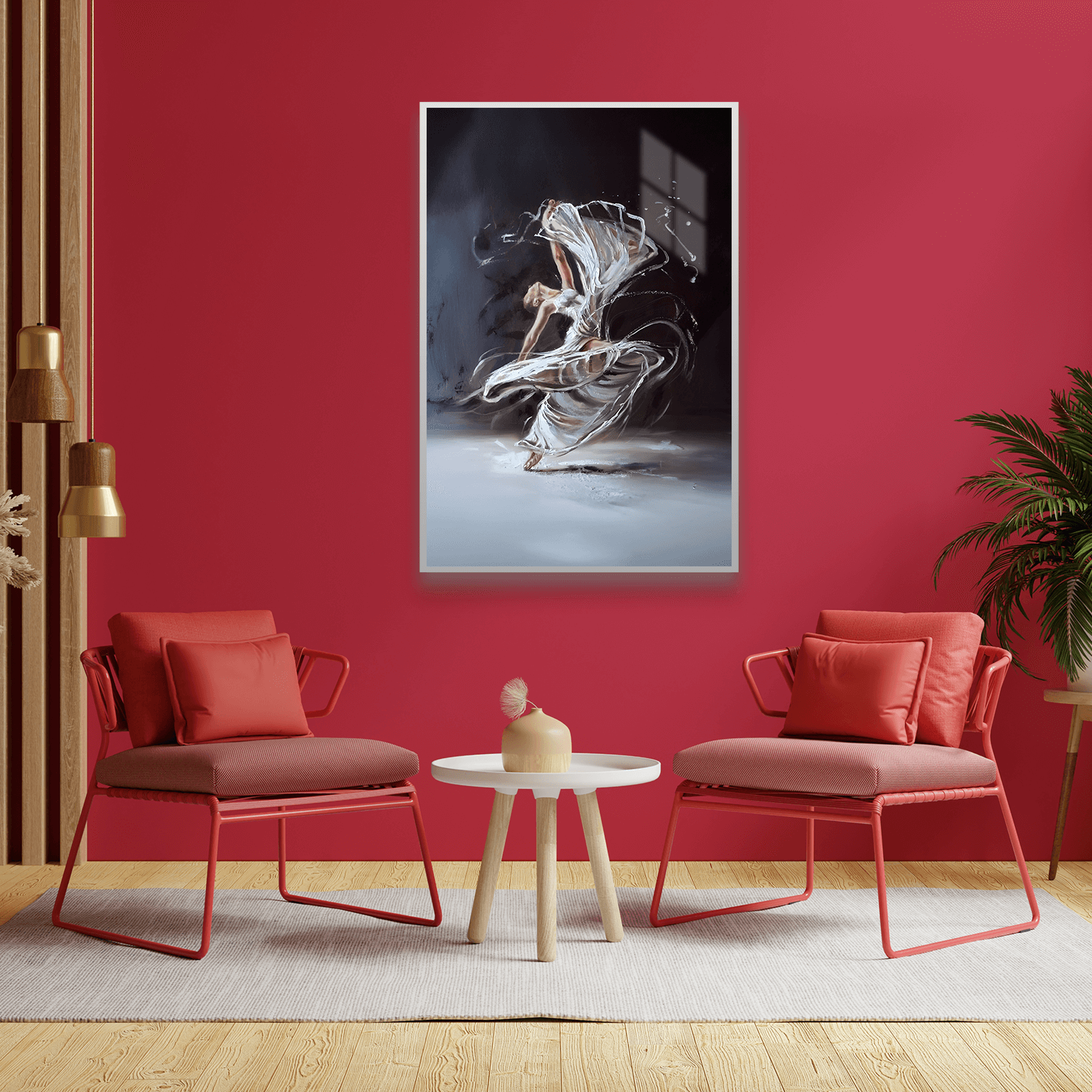 Parlak cam yüzey, beyazın tonlarını daha net ve ışıkla uyum içinde göstererek tabloyu cam yüzeyli tablolar koleksiyonunda öne çıkarır. Dansın hareketi camın yansısıyla daha da canlı hâle gelir.