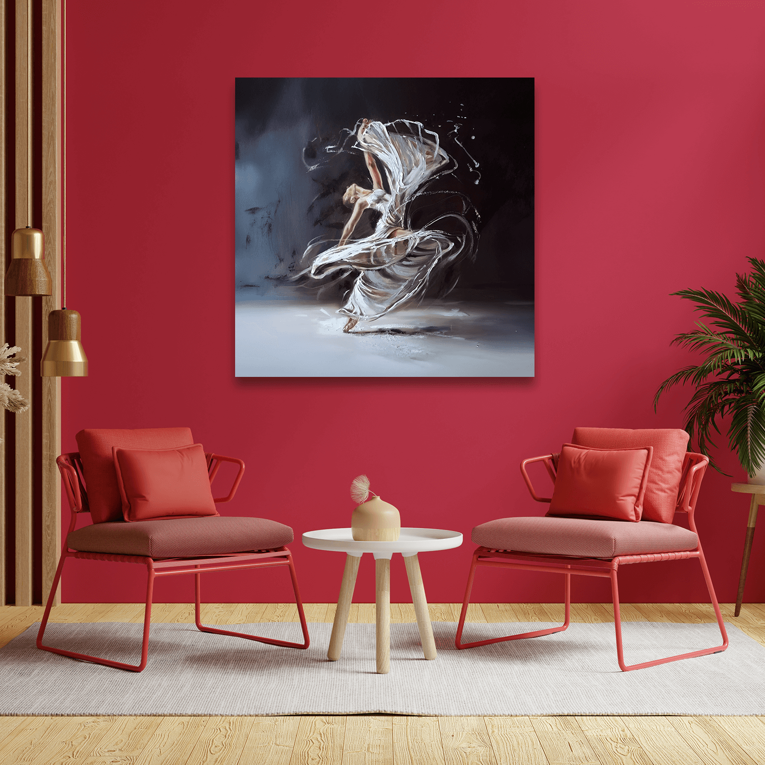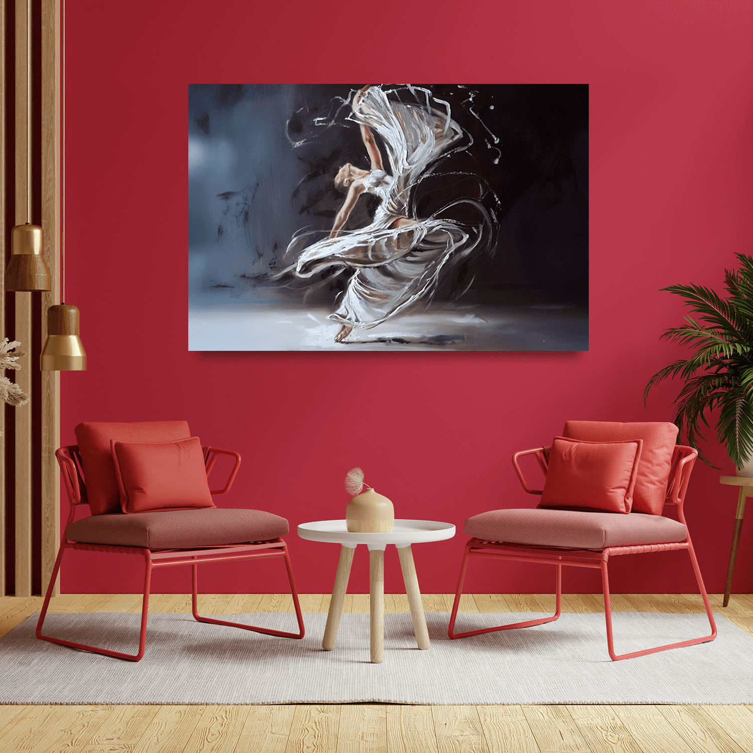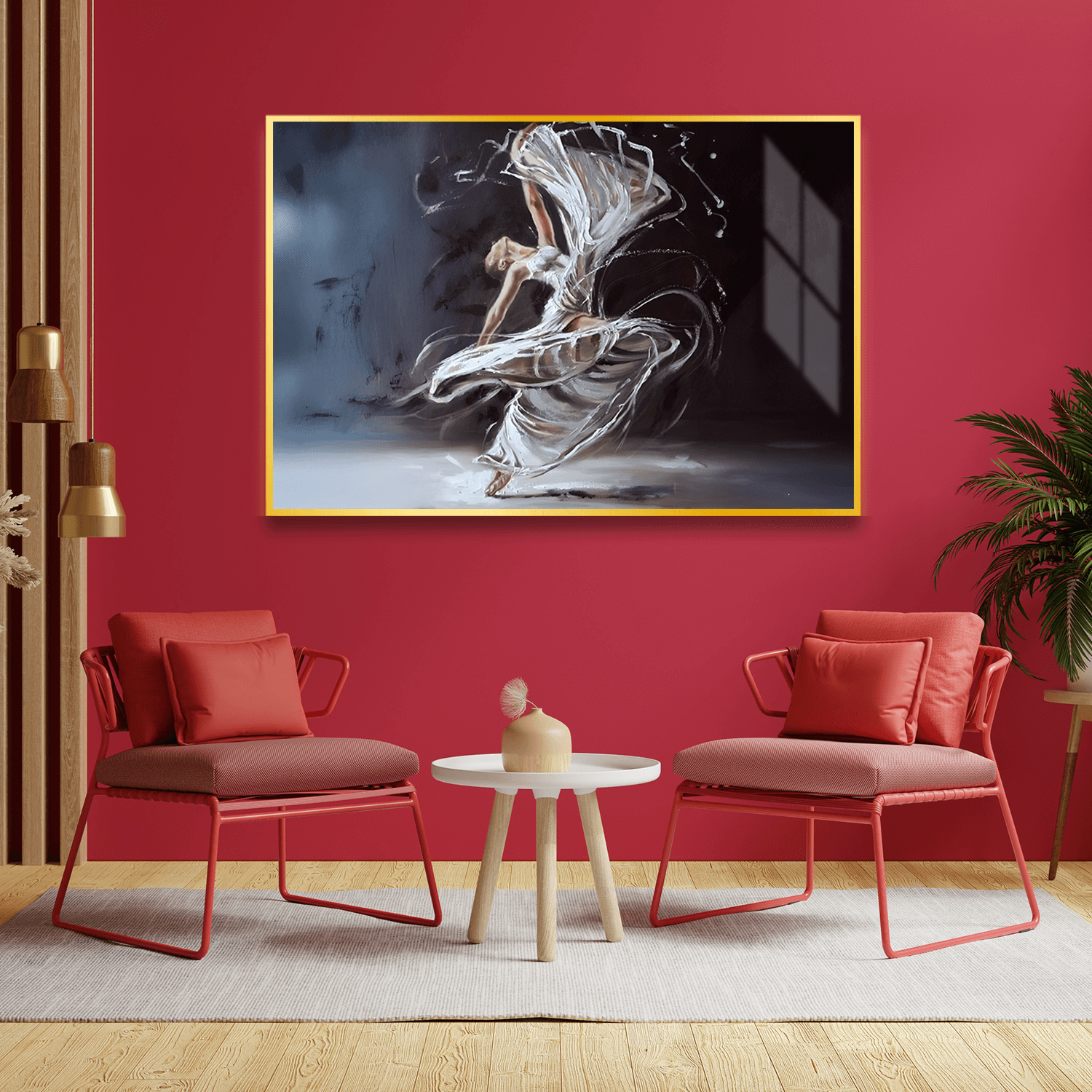 Parlak cam yüzey, beyazın tonlarını daha net ve ışıkla uyum içinde göstererek tabloyu cam yüzeyli tablolar koleksiyonunda öne çıkarır. Dansın hareketi camın yansısıyla daha da canlı hâle gelir.
