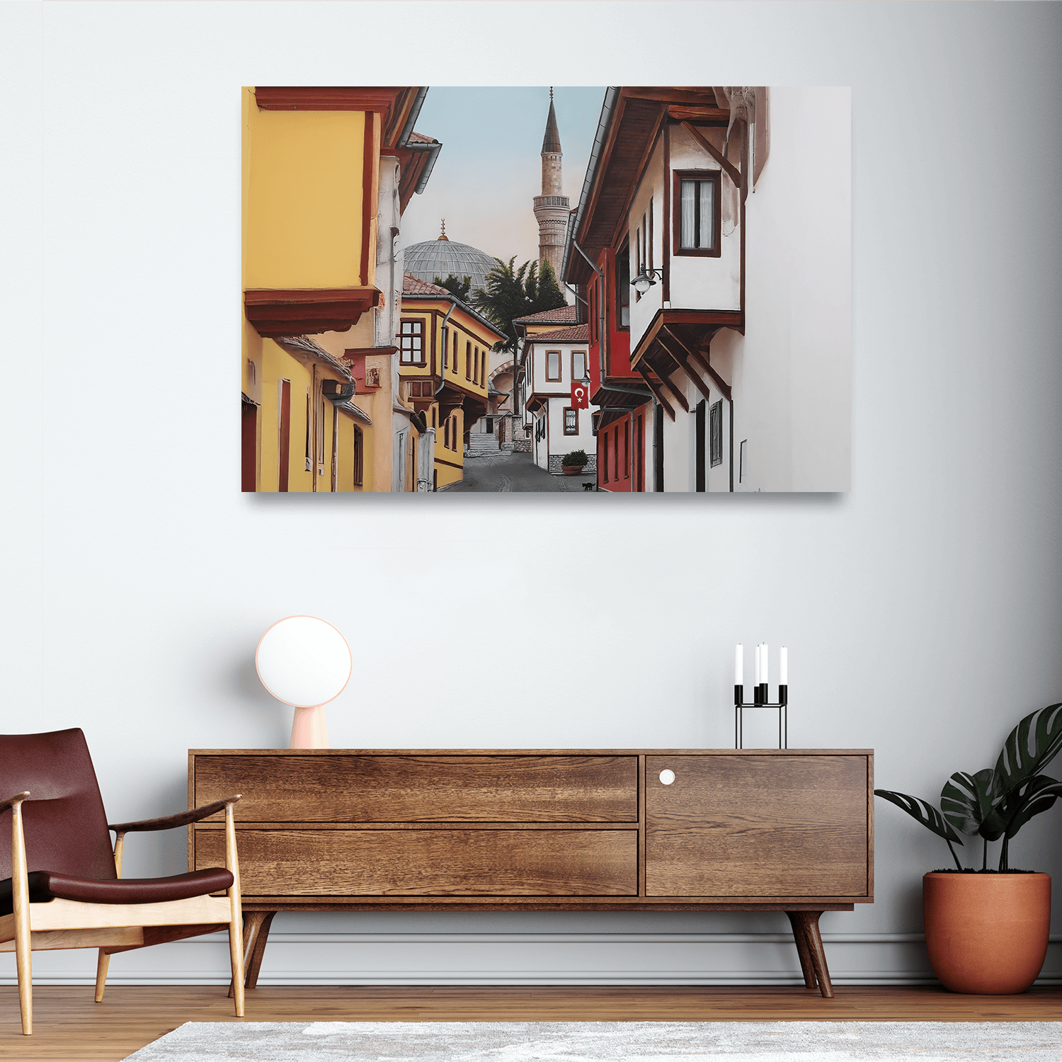 Geleneksel mahalle estetiğiyle ev sıcaklığını taşıyan bu tablo, salon dekorasyonu için nostaljik tablolar arasında huzur veren bir odak noktası oluşturur.