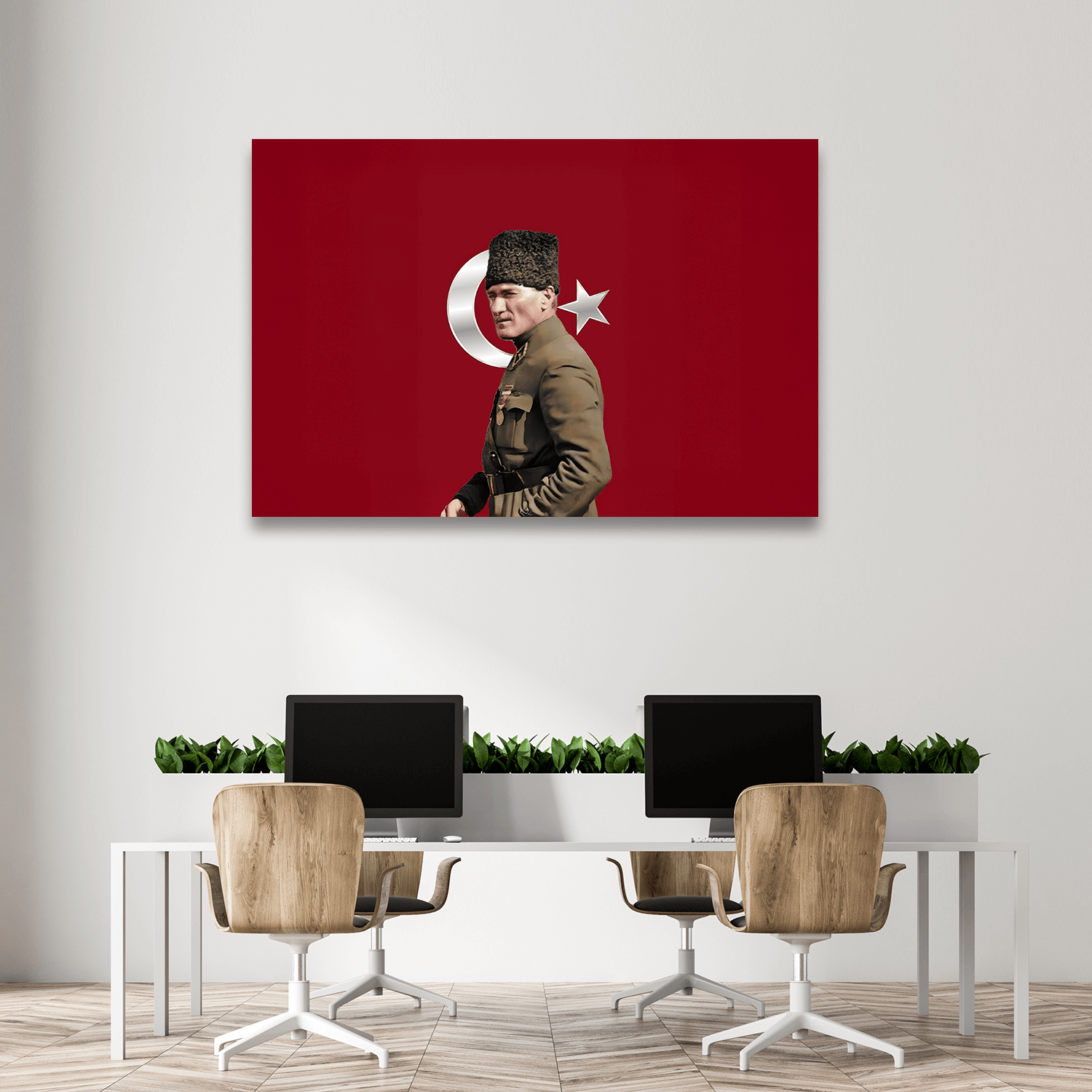 Işığı zarifçe yansıtan parlak dokusuyla bu eser, cam yüzeyli Atatürk tabloları arasında modern ve çağdaş mekanlara tarihî bir ruh kazandırmak isteyenler için çarpıcı bir seçenektir.