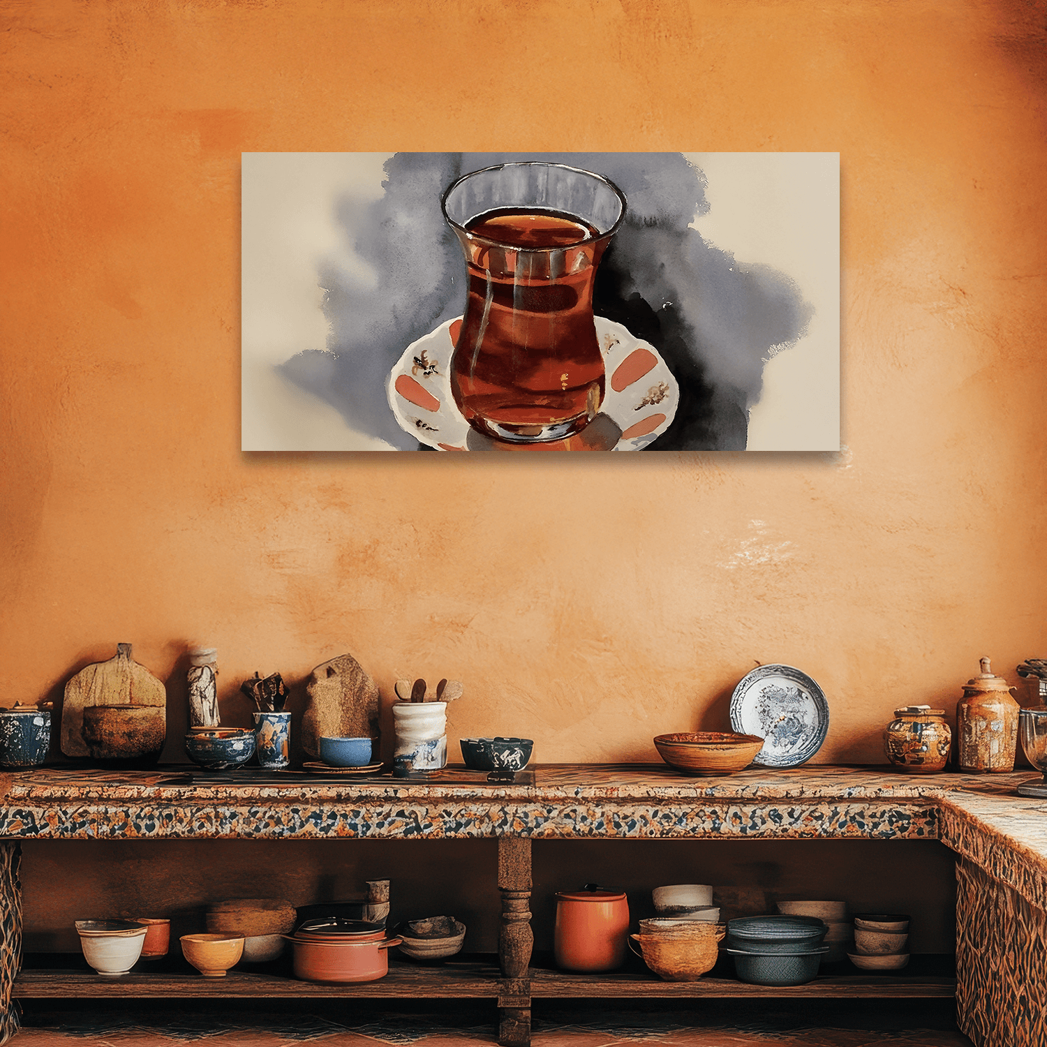Sade çizgileri ve iç açıcı temasıyla, mutfak dekorasyonuna uygun tablo seçenekleri arasında hem iştah açan hem de estetik bir denge kurar. Çay severlerin kalbine hitap eden bir dokunuş.