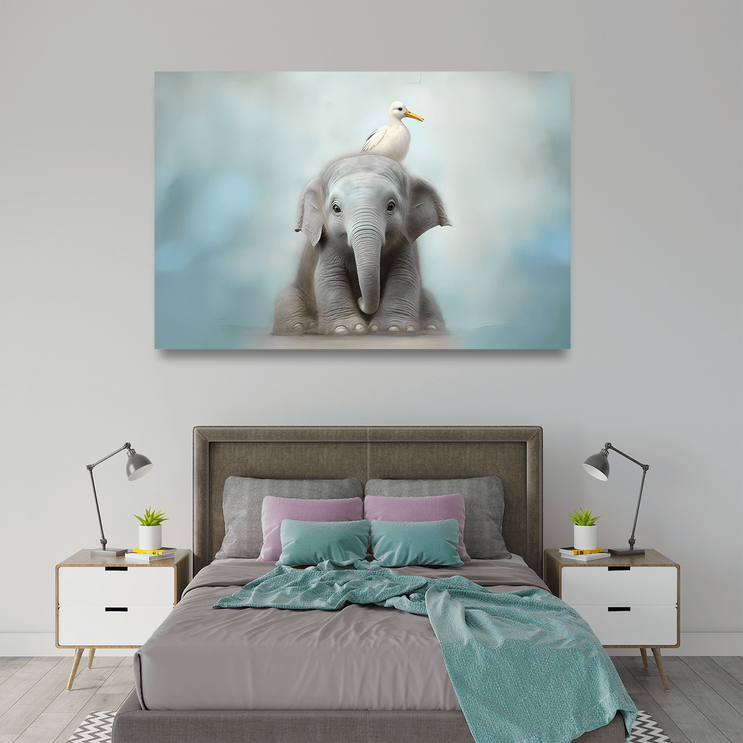 Bebek filin sevimli duruşu ve kuşun nazik varlığıyla bu eser, çocuk odası için dekoratif tablolar koleksiyonunda çocukların hayal gücünü destekleyen ve sevgi dolu bir atmosfer oluşturan bir seçenek sağlıyor.