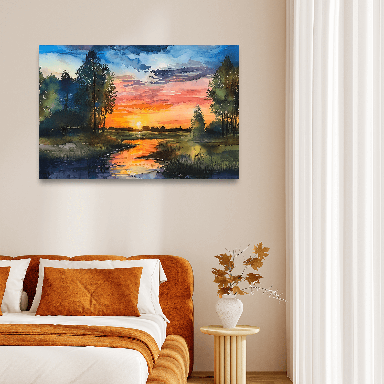 “Göl Kenarında Günbatımı”, salon dekorasyonuna sıcaklık ve romantizm katmak isteyenler için salon için gün batımı tabloları arasında zarif bir odak noktasıdır.
