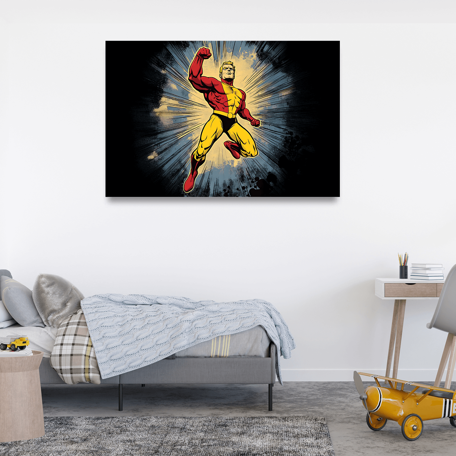 Süper kahramanın enerjik tasarımı, yatak odası dekoratif tabloları koleksiyonunda modern ve dinamik bir atmosfer yaratmak isteyenler için ideal bir seçim sunuyor.