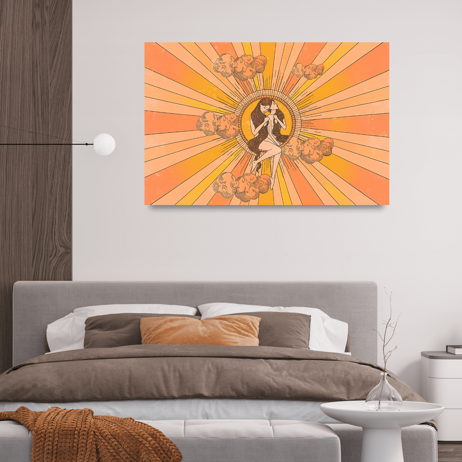 “Güneşin İkiz Ruhları”, yaşam alanlarında içsel uyumu arayanlar için duvar dekorasyonu için anlamlı tablolar arasında zarif ve anlamlı bir tercih sunar.