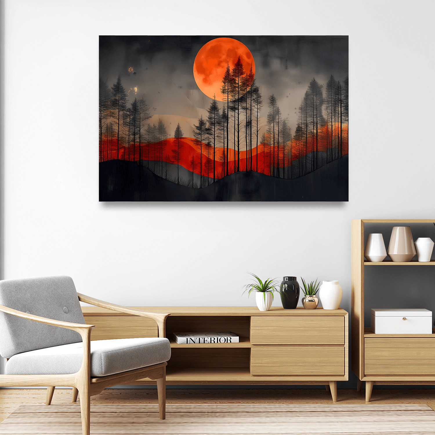 “Kanlı Ayın Gölgesinde”, salon dekorasyonunda dikkat çekici ve anlamlı bir atmosfer oluşturmak isteyenler için salon için mistik gökyüzü tabloları arasında özel bir tercih sunar.