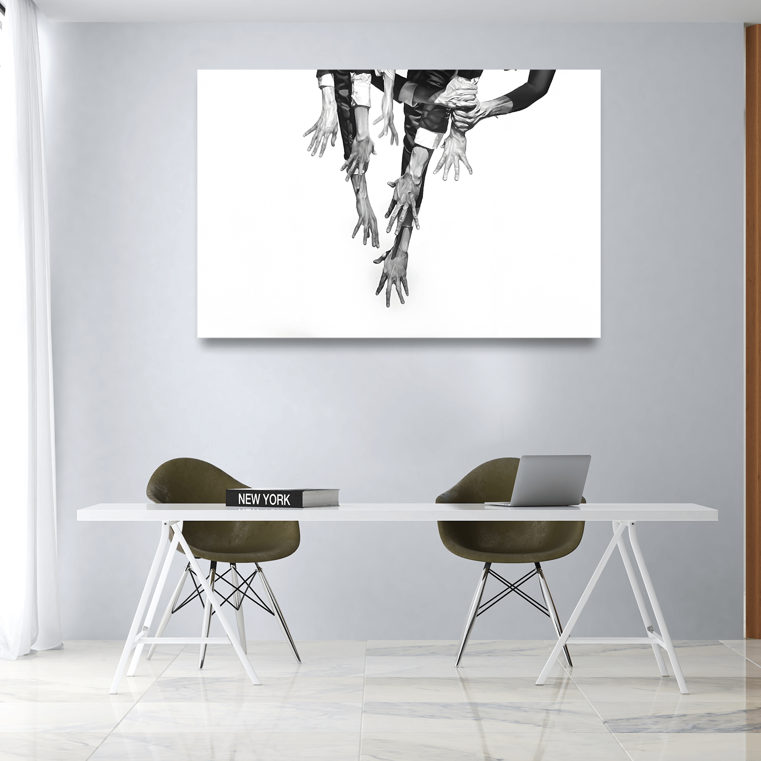 Sanatsal bir sohbet başlatan bu eser, salon için anlam yüklü dekoratif tablolar arasında hem çağdaş hem de dikkat çekici bir atmosfer sunar.