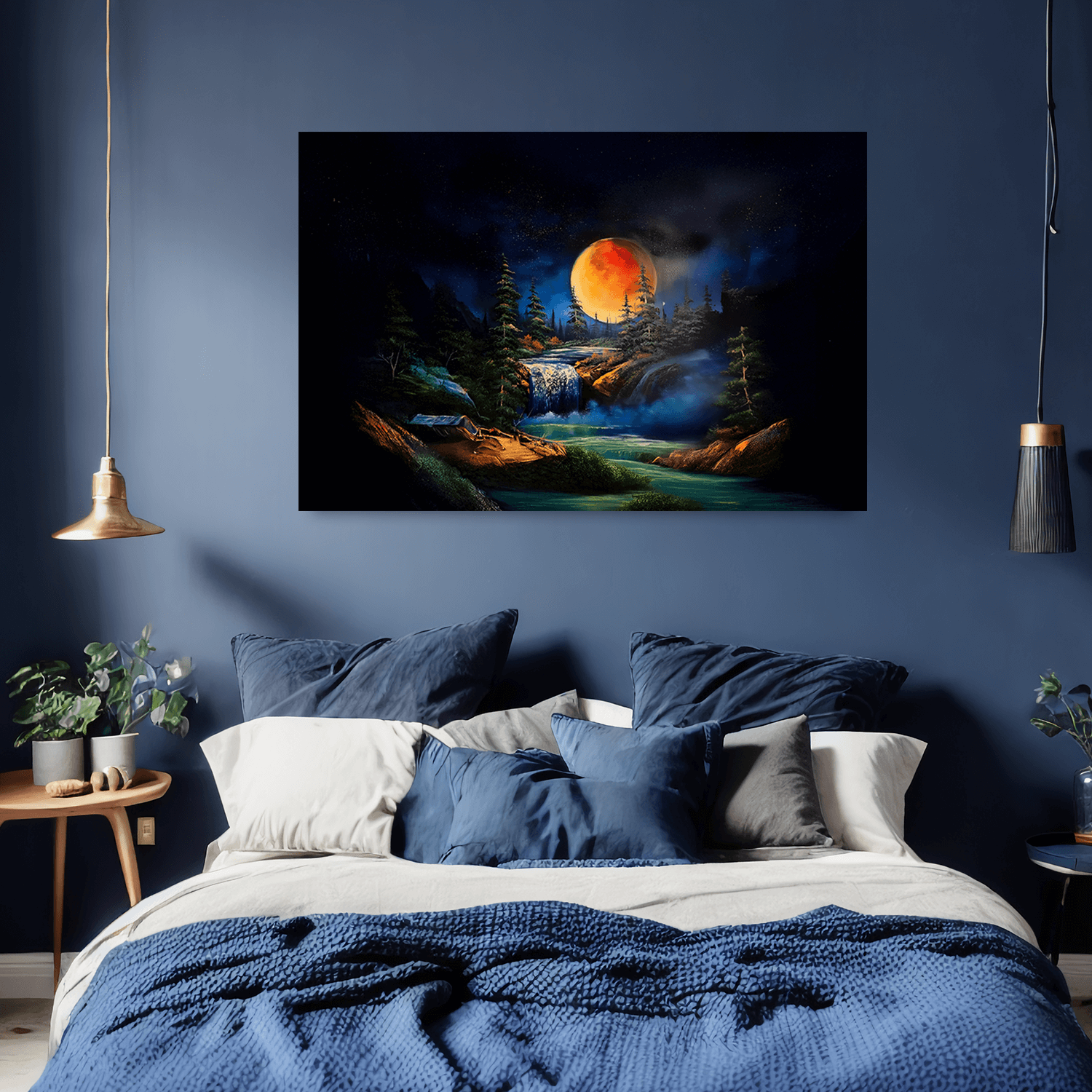 Bu eser, gecenin huzuru ve kızıl ayın çağrısını yansıtarak duvar dekorasyonu için mistik tablolar arasında benzersiz bir atmosfer sunar. Sakinlik ve derinlik arayanlar için etkileyici bir odak noktasıdır.