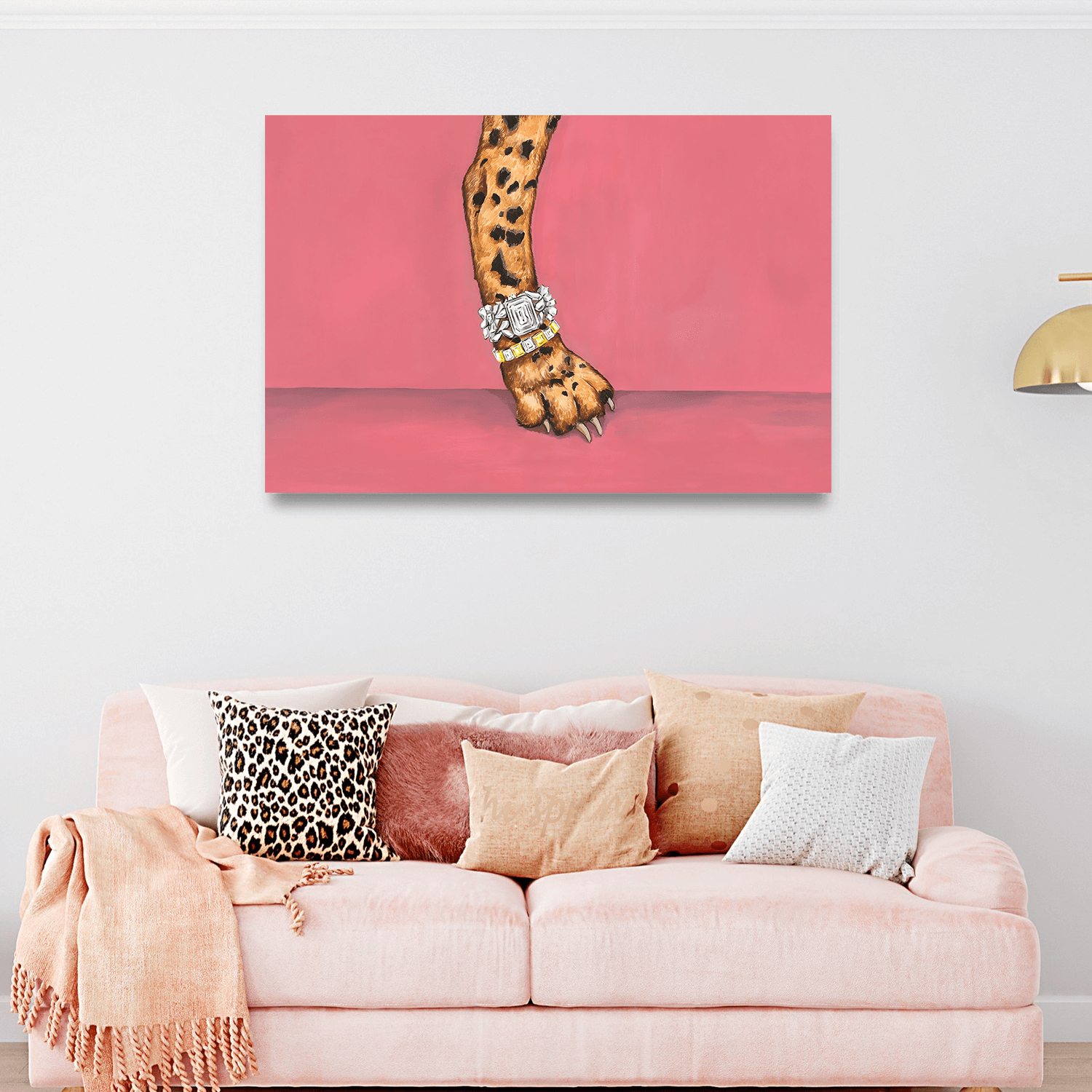 Leoparın güçlü duruşu ve mücevher detaylarının göz alıcı kombinasyonu, modern salon tabloları koleksiyonunda cesur bir stil yaratmak isteyenler için ideal bir seçenek sunuyor.