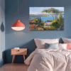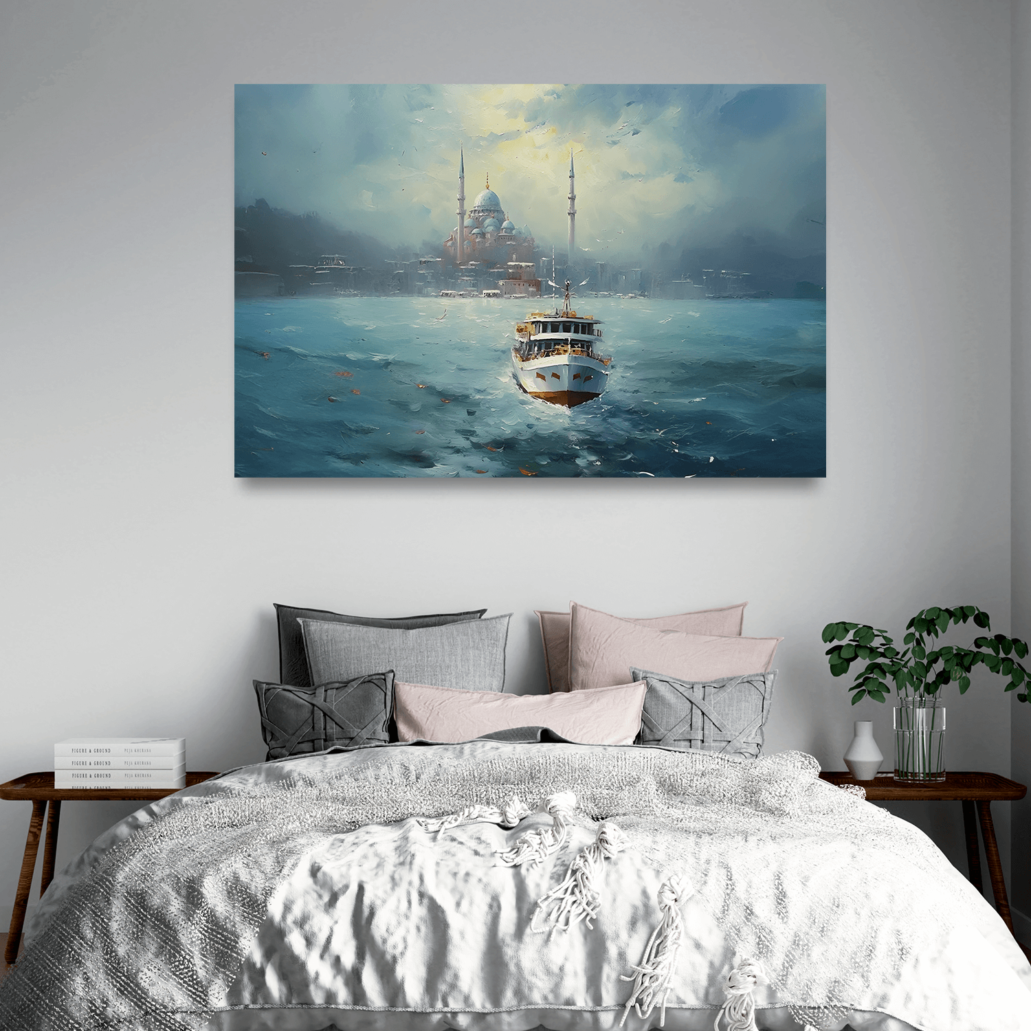 “Martılar ve Minareler”, yatak odası dekorasyonuna sade bir İstanbul romantizmi katmak isteyenler için yatak odası için huzur veren şehir tabloları arasında özel bir yer tutar.