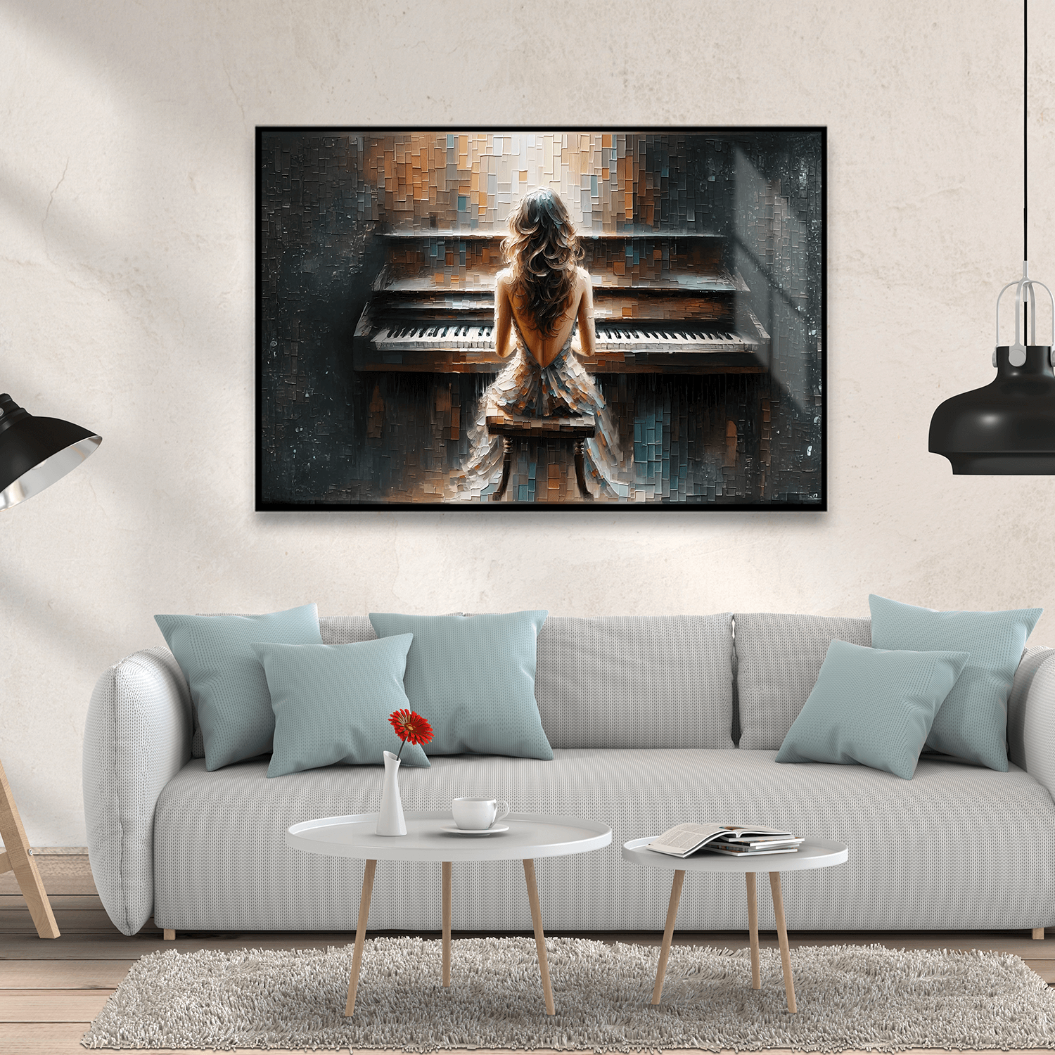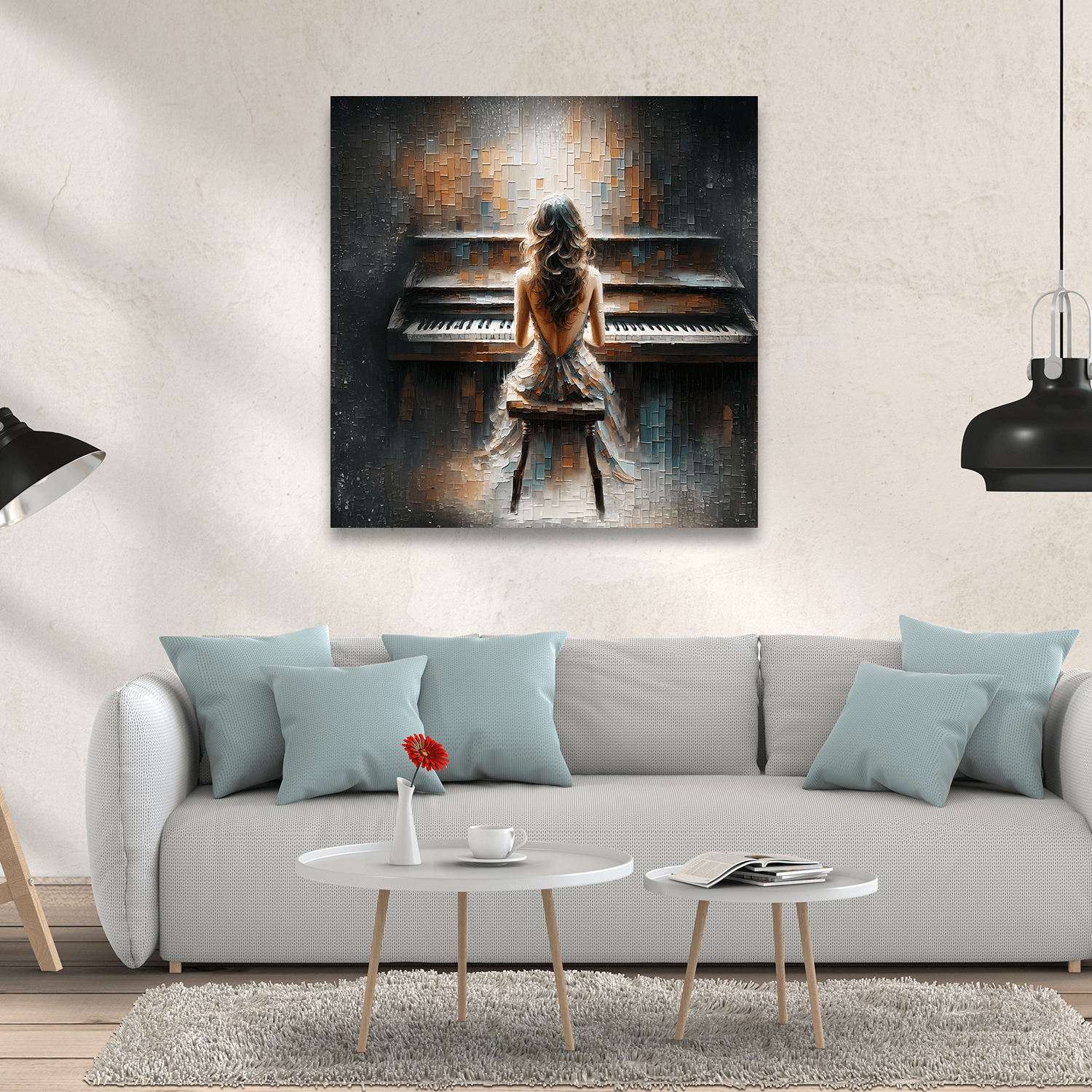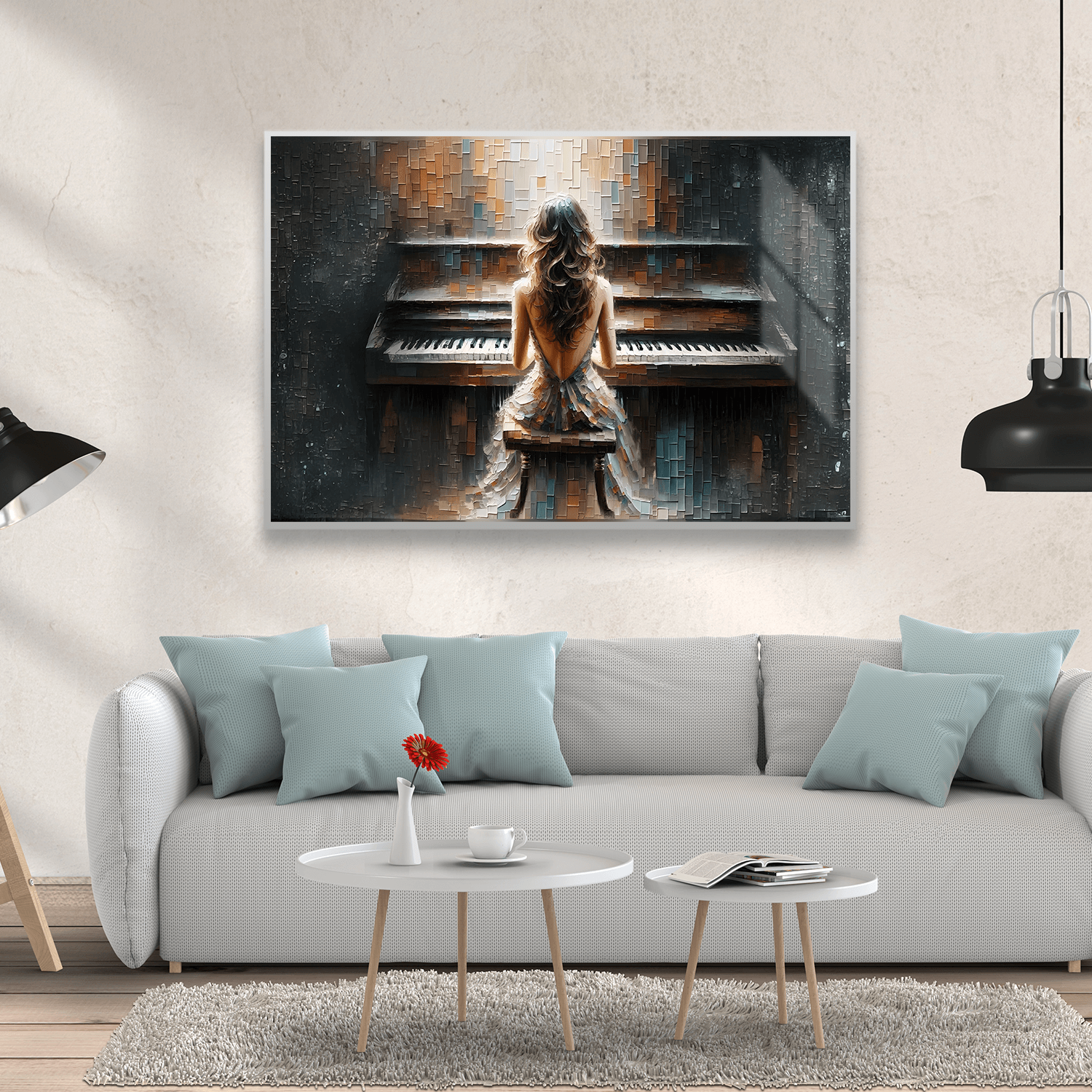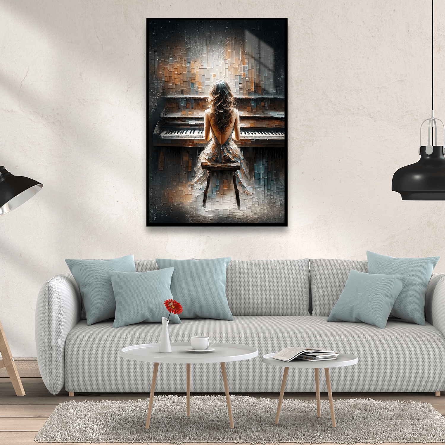 “Melodinin Arkası”, kadın figürünün sırtından yansıyan zarif bir duruşla, melodilerin ötesinde kalan duygulara ve içsel sessizliğe odaklanır. Bu eser, kadın figürlü müzik temalı tablolar arasında hem görsel şiirselliği hem de duygusal derinliğiyle öne çıkar.