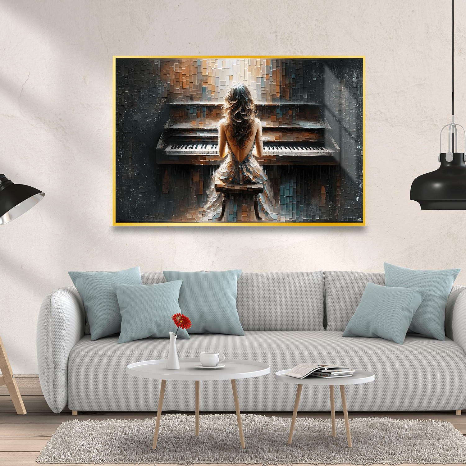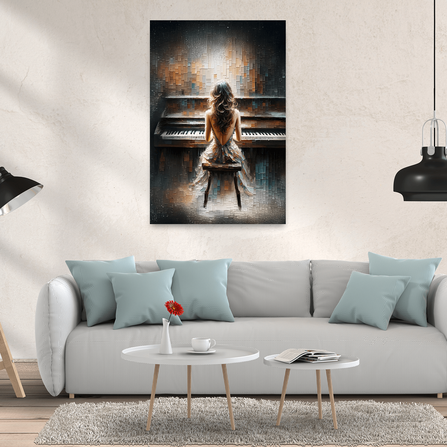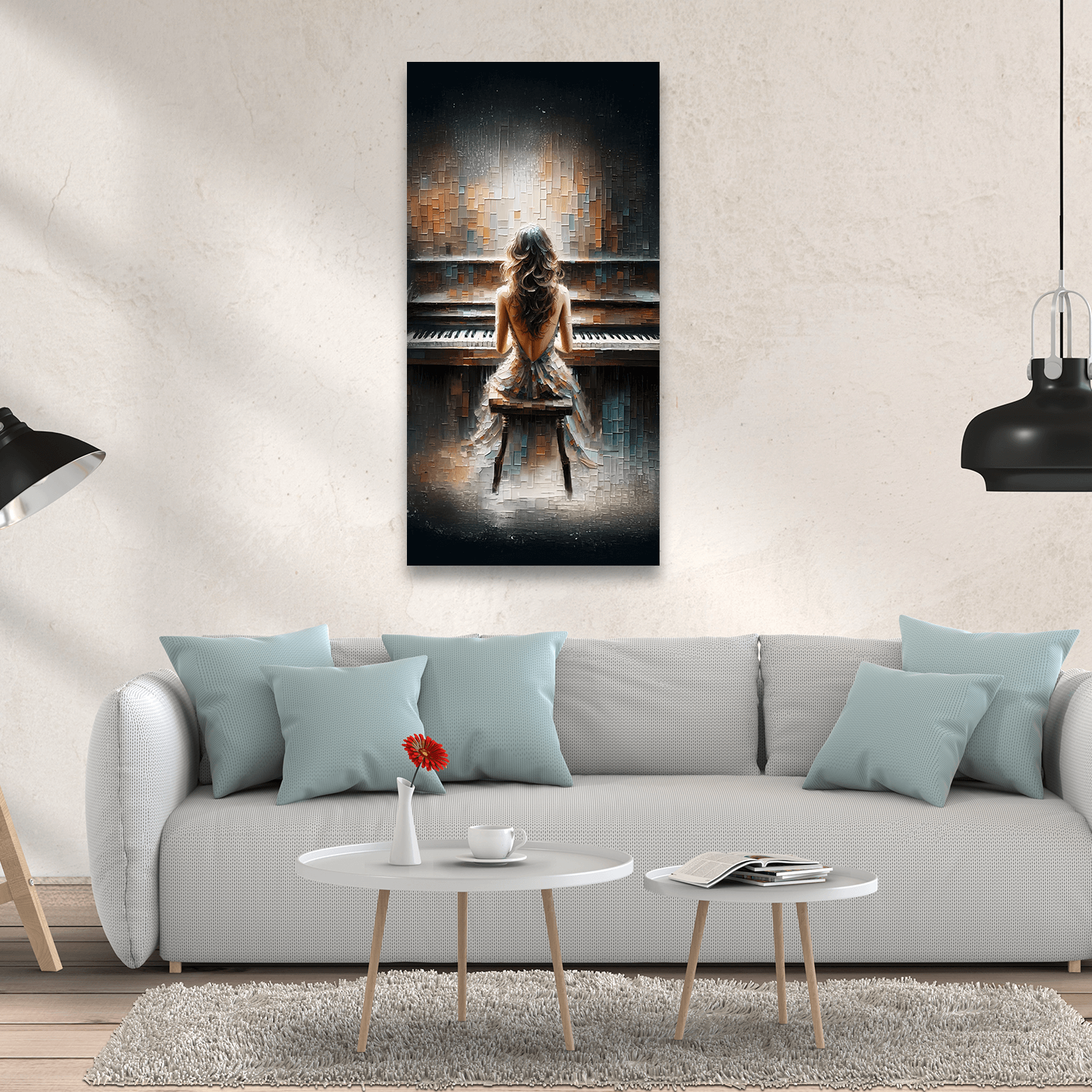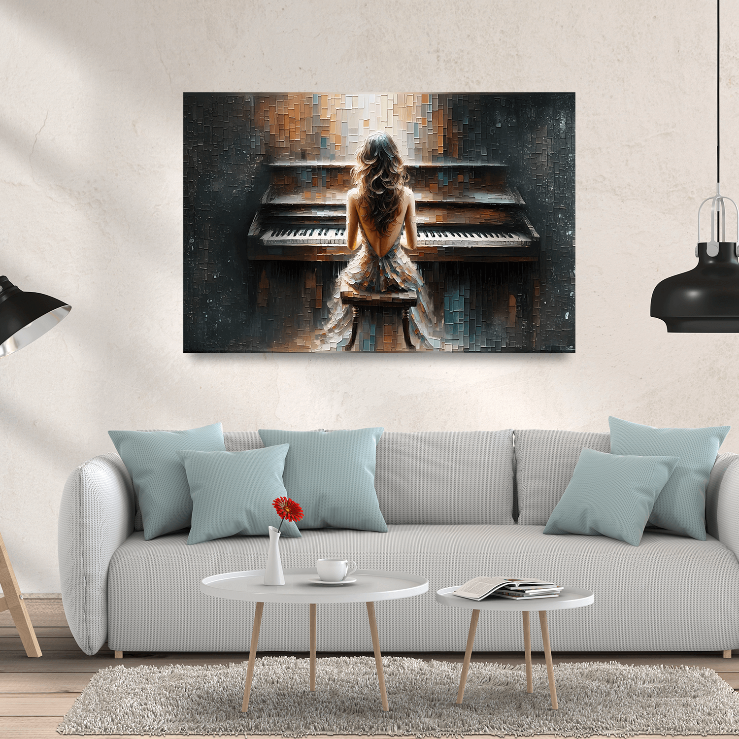 “Melodinin Arkası”, kadın figürünün sırtından yansıyan zarif bir duruşla, melodilerin ötesinde kalan duygulara ve içsel sessizliğe odaklanır. Bu eser, kadın figürlü müzik temalı tablolar arasında hem görsel şiirselliği hem de duygusal derinliğiyle öne çıkar.