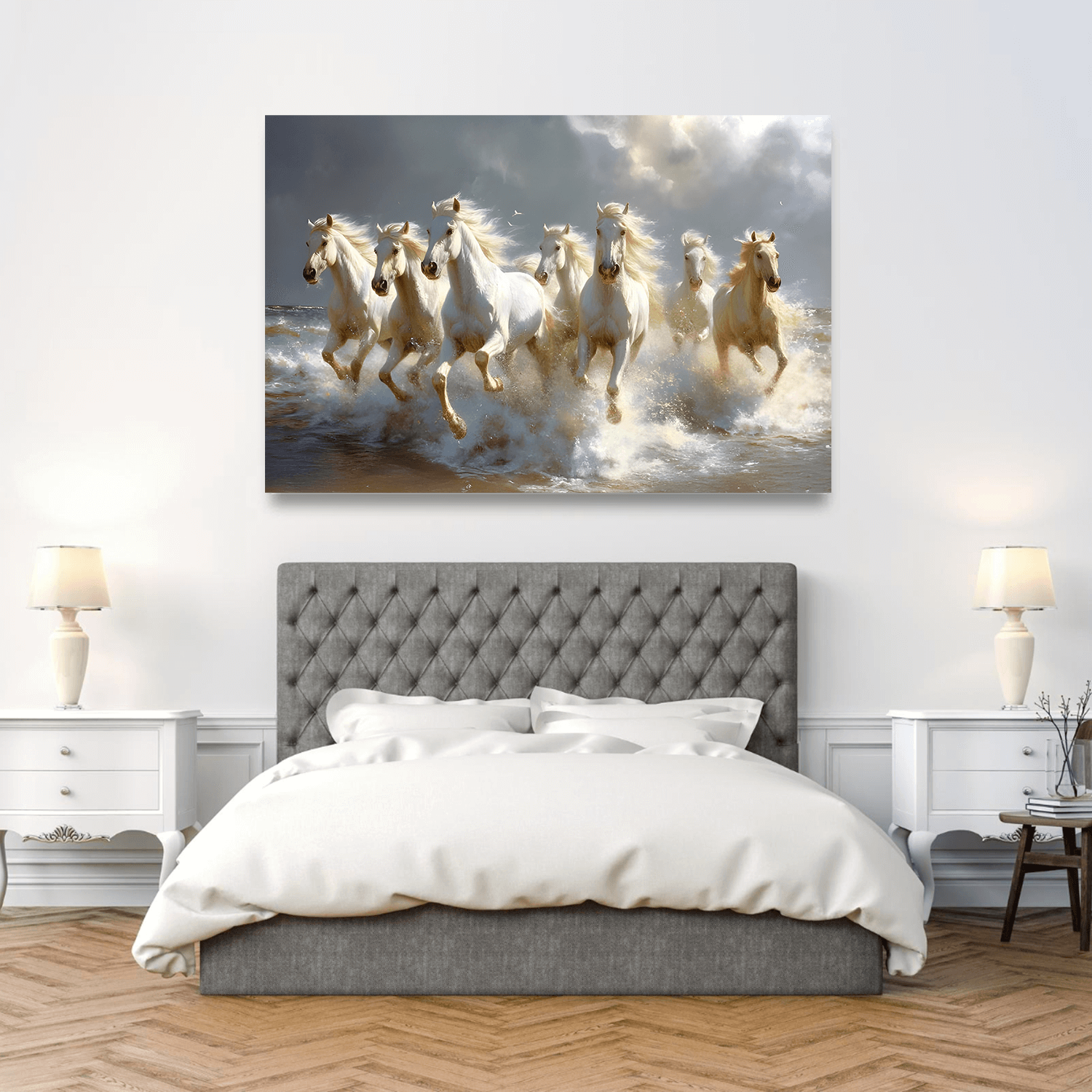 Atların zarif hareketleri ve okyanus dalgalarının enerjisi, bu tabloyu modern salon tabloları koleksiyonunda estetik ve güçlü bir odak noktası haline getiriyor.