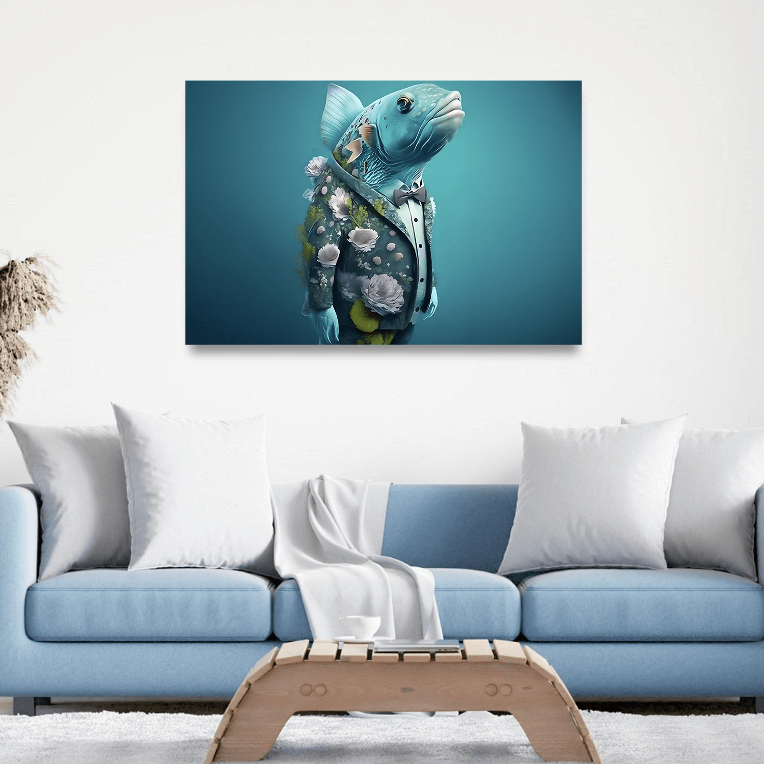 “Okyanusun Centilmeni” tablosu, denizlerin gizemli dünyasını şıklıkla birleştiren eğlenceli ve çarpıcı bir sanat eseri. Zarif smokiniyle sofistike bir duruş sergileyen balık figürü, sanatsal ironinin en etkileyici yorumlarından biri olarak karşımıza çıkıyor. Sanatsal kanvas tablolar koleksiyonunda mizahi bir dokunuş arayanlar için mükemmel bir seçenek.