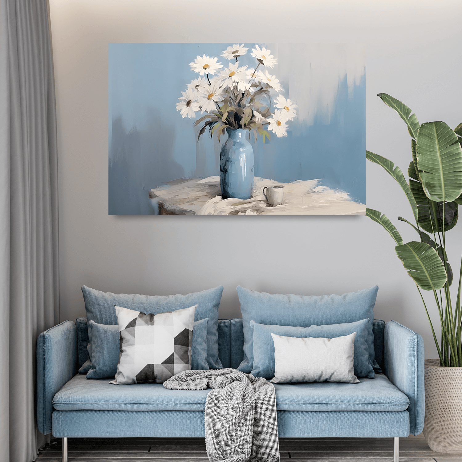 Klasik bir dokunuş isteyenler için bu versiyon, kanvas yüzeyli tabloları arasında yer alır. Papatyaların sade güzelliği, dokulu yüzeyde daha doğal ve hissedilir bir hâl alır.