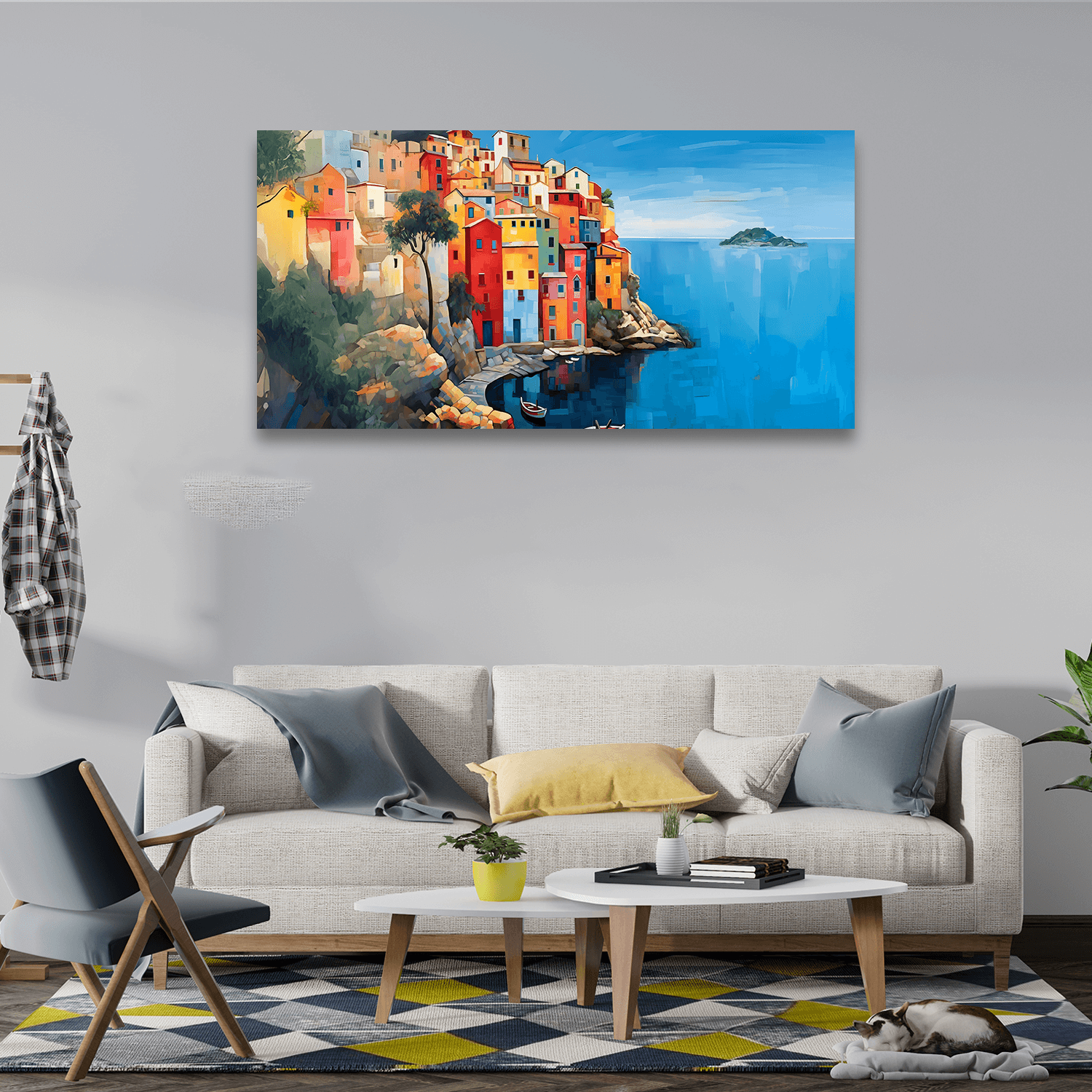 “Renklerin Kasabası”, canlı tonlarla şekillenen mimari unsurlar ve hareketli kompozisyonuyla, renkli sanat tabloları kategorisinde pozitif enerjiyi duvarlara taşıyan modern bir manzara yorumu sunar.