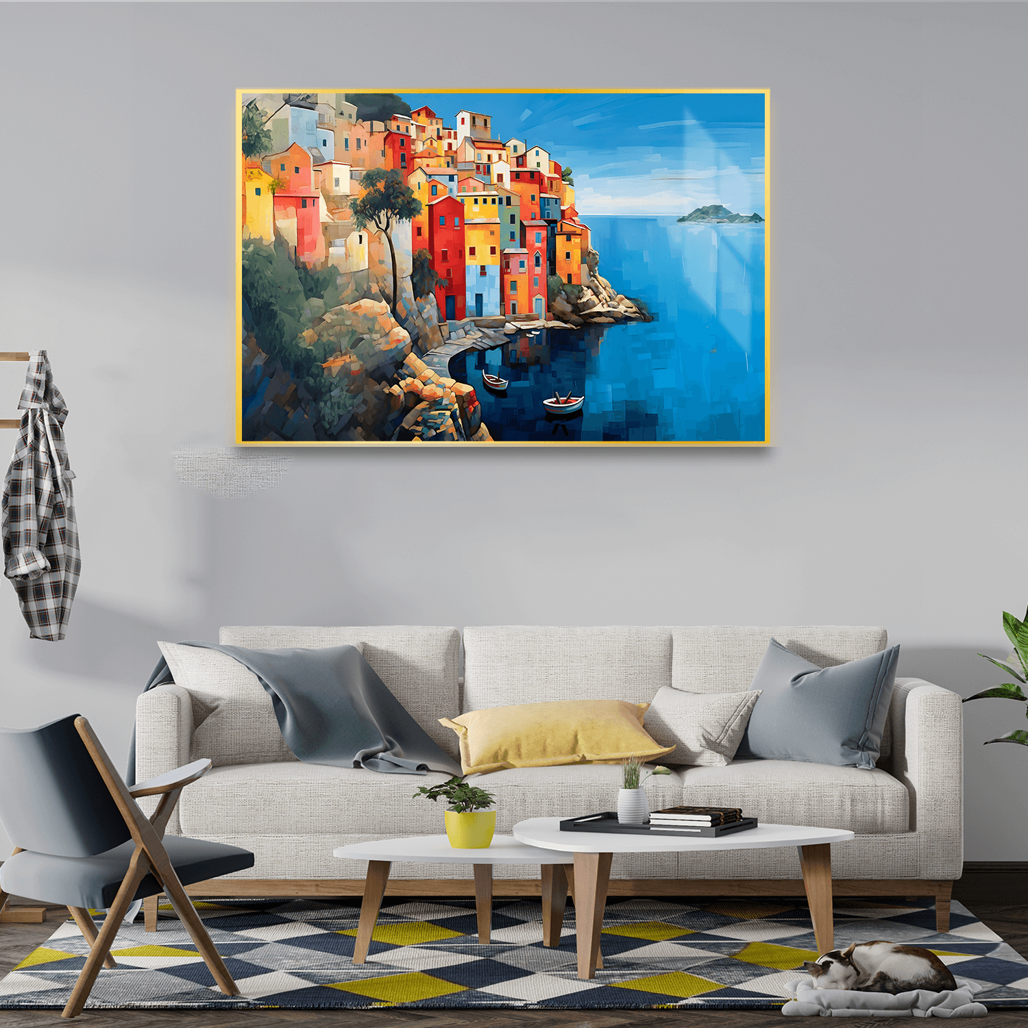 Parlak cam yüzey, yapıların renk geçişlerini ve kasabanın detaylarını net biçimde yansıtarak tabloyu cam yüzeyli dekoratif tablolar kategorisinde modern ve dikkat çekici bir seçenek hâline getirir.