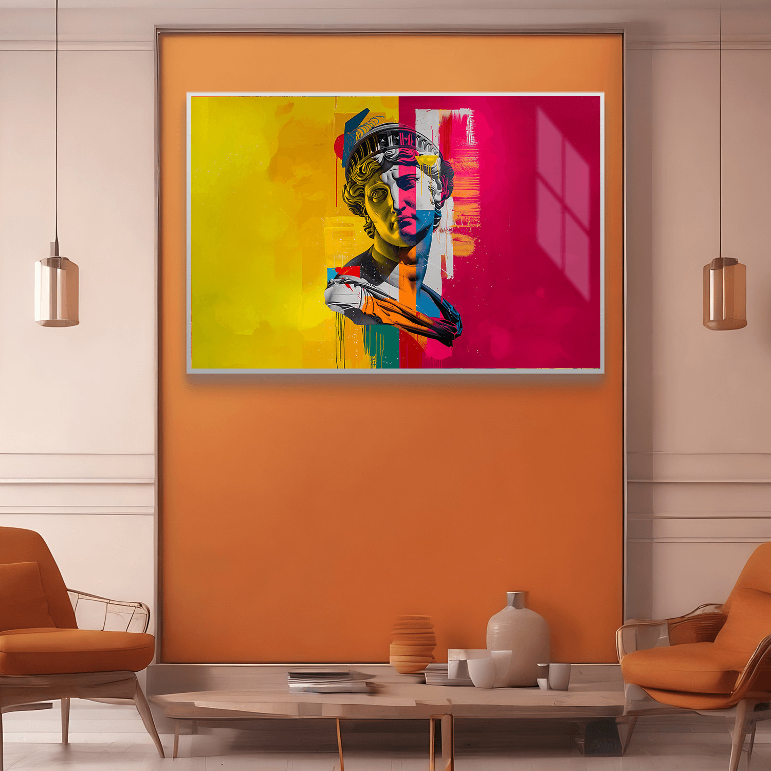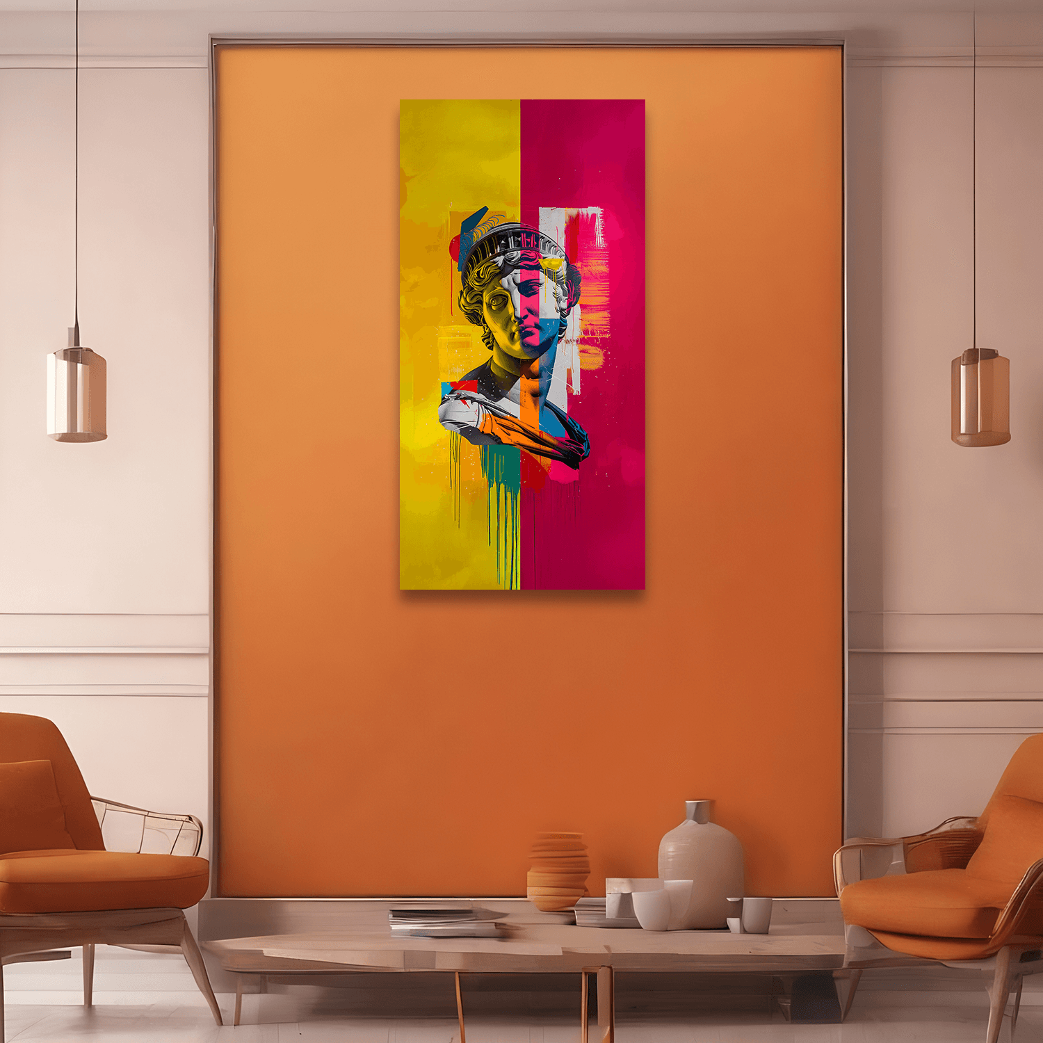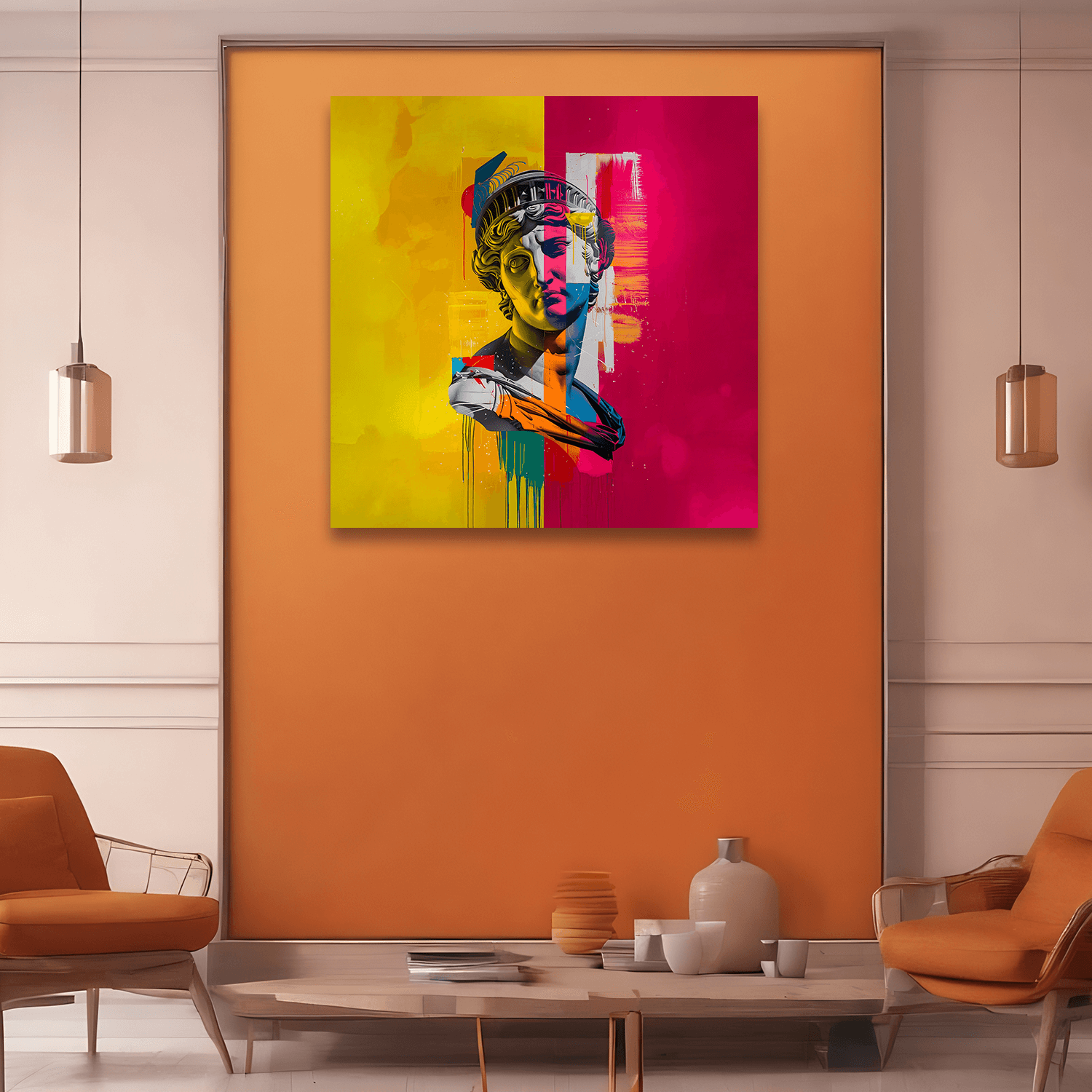 “Renkli Heykel”, klasik imgelerin enerjik bir yorumuyla duvar dekorasyonu için pop kültürden beslenen tablolar arasında fark yaratan güçlü bir seçenektir.