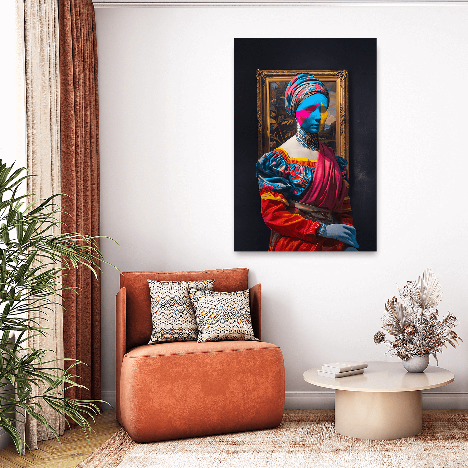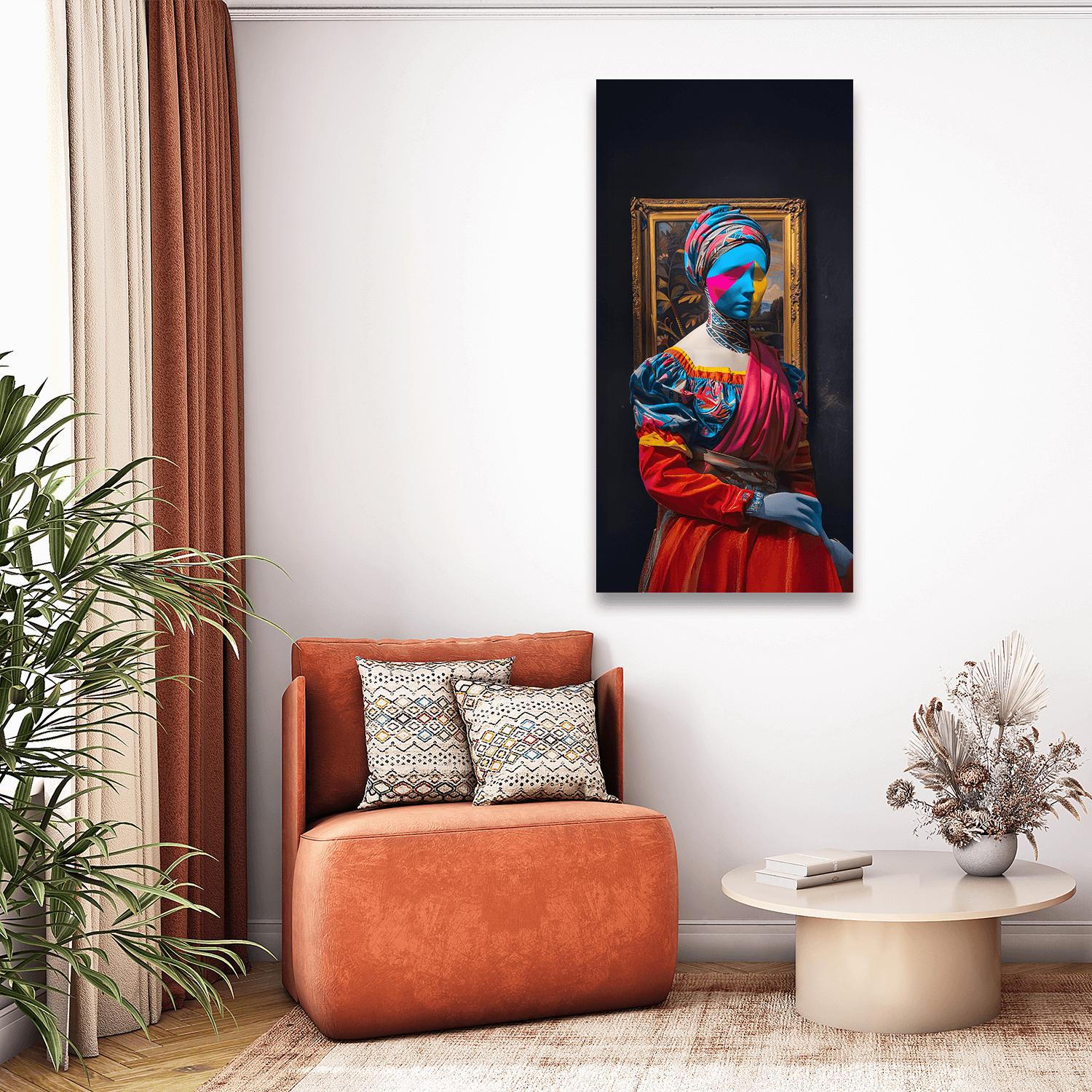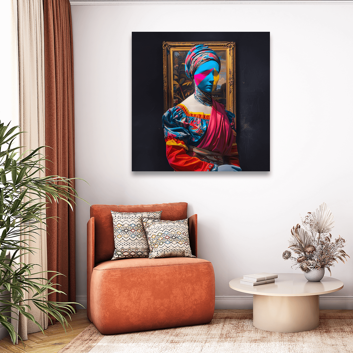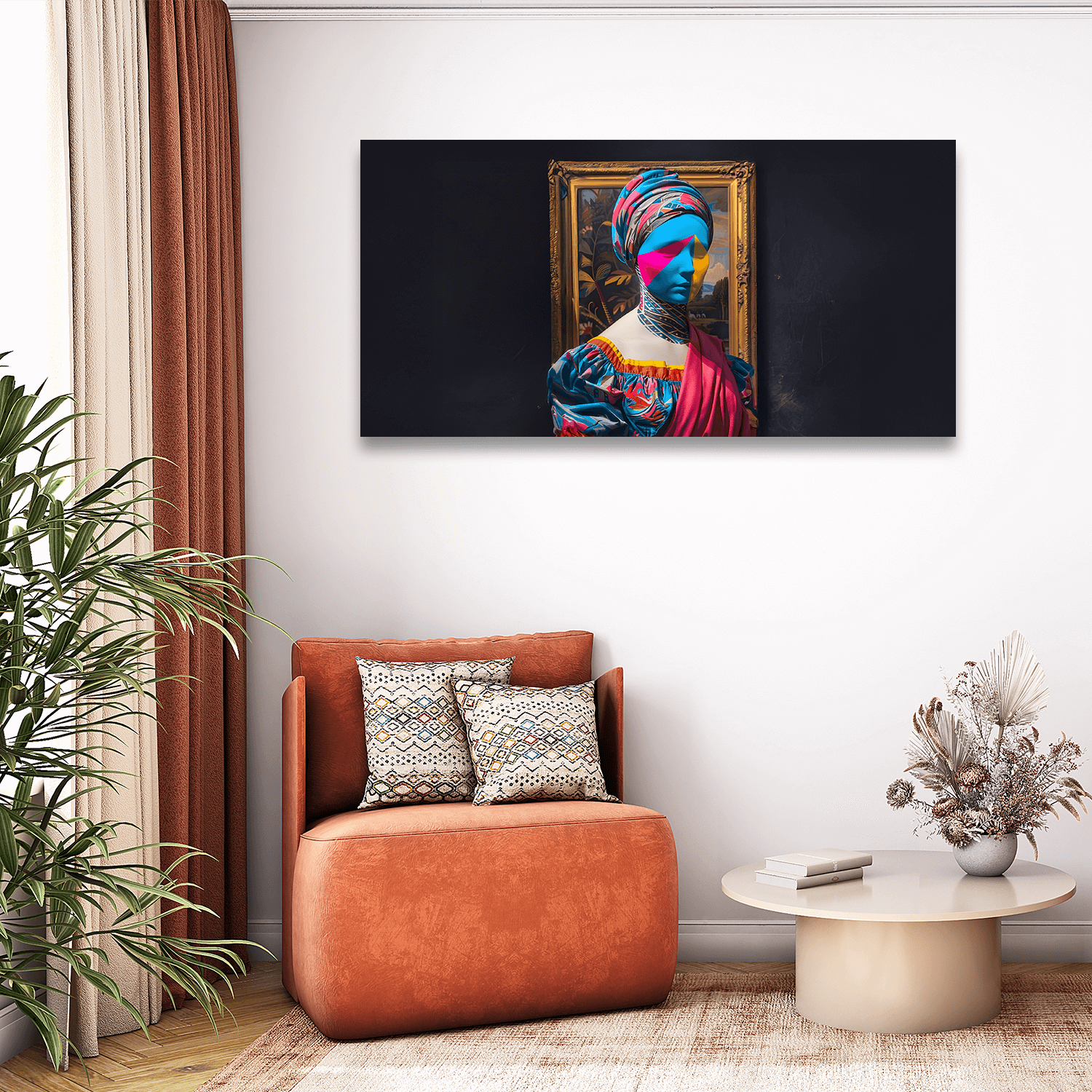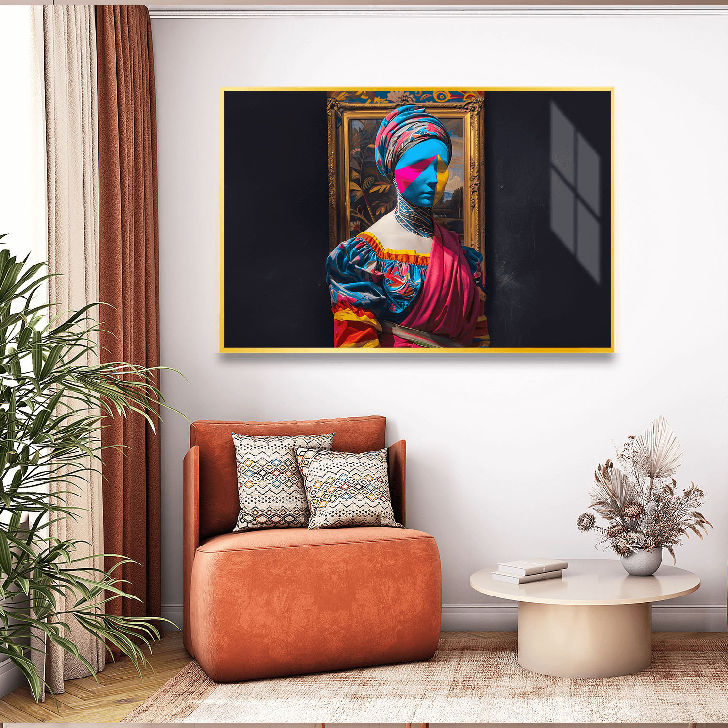 Bu eser, salon dekorasyonunda sade ama çarpıcı bir estetik arayanlar için salon için figürlü tablolar arasında dikkat çekici bir odak noktası sunar.