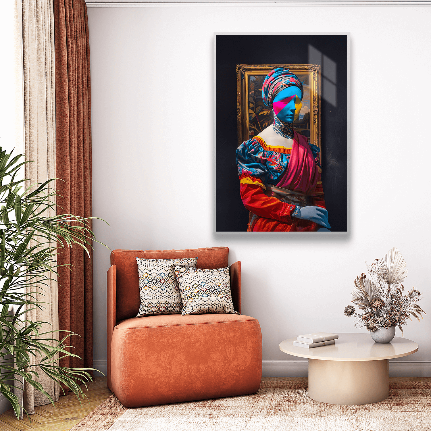 Parlak cam yüzey, yüz ifadesindeki durgunluğu ve renklerin akışkanlığını net biçimde ortaya koyarak tabloyu cam yüzeyli sanat tabloları kategorisinde modern ve zarif bir çizgiye taşır.
