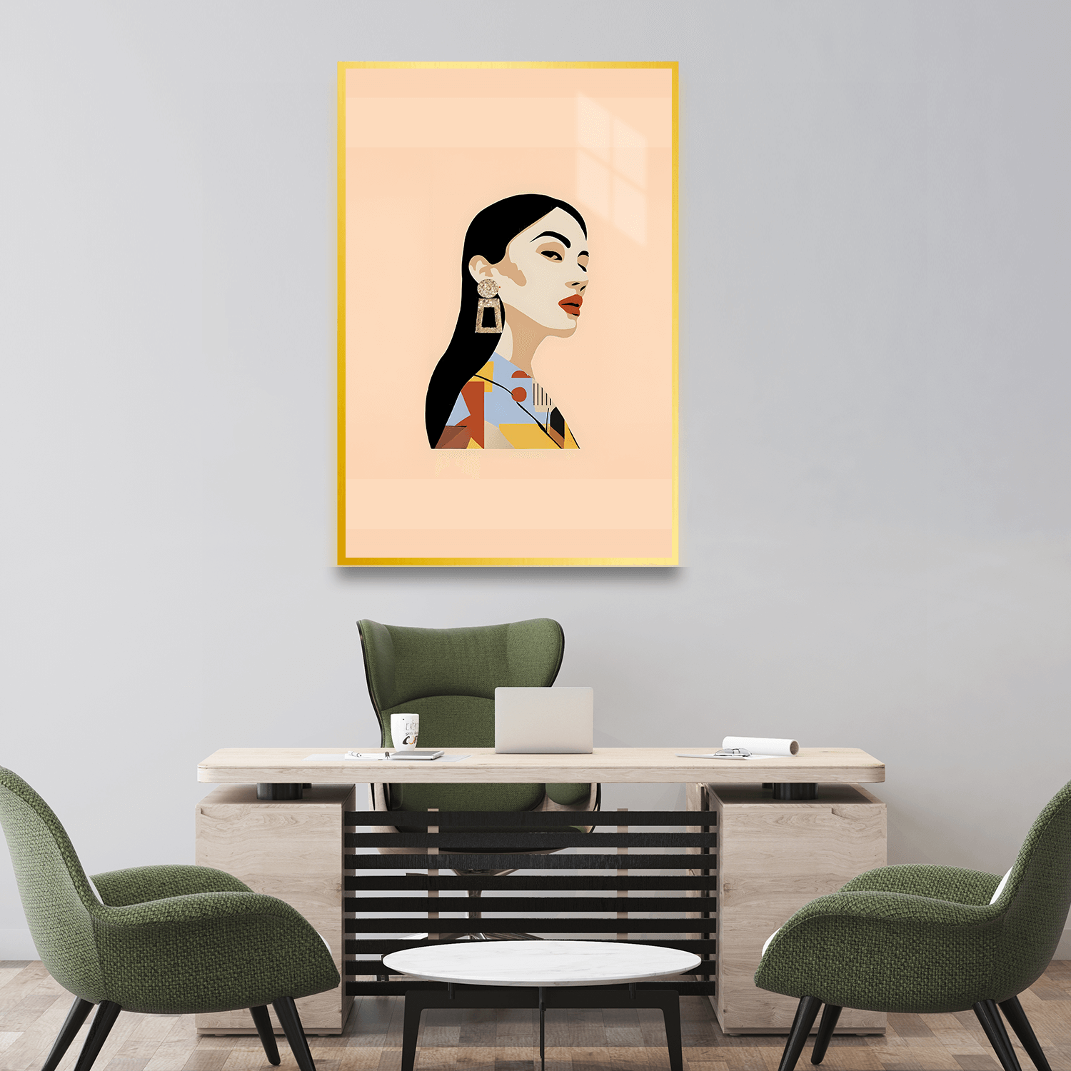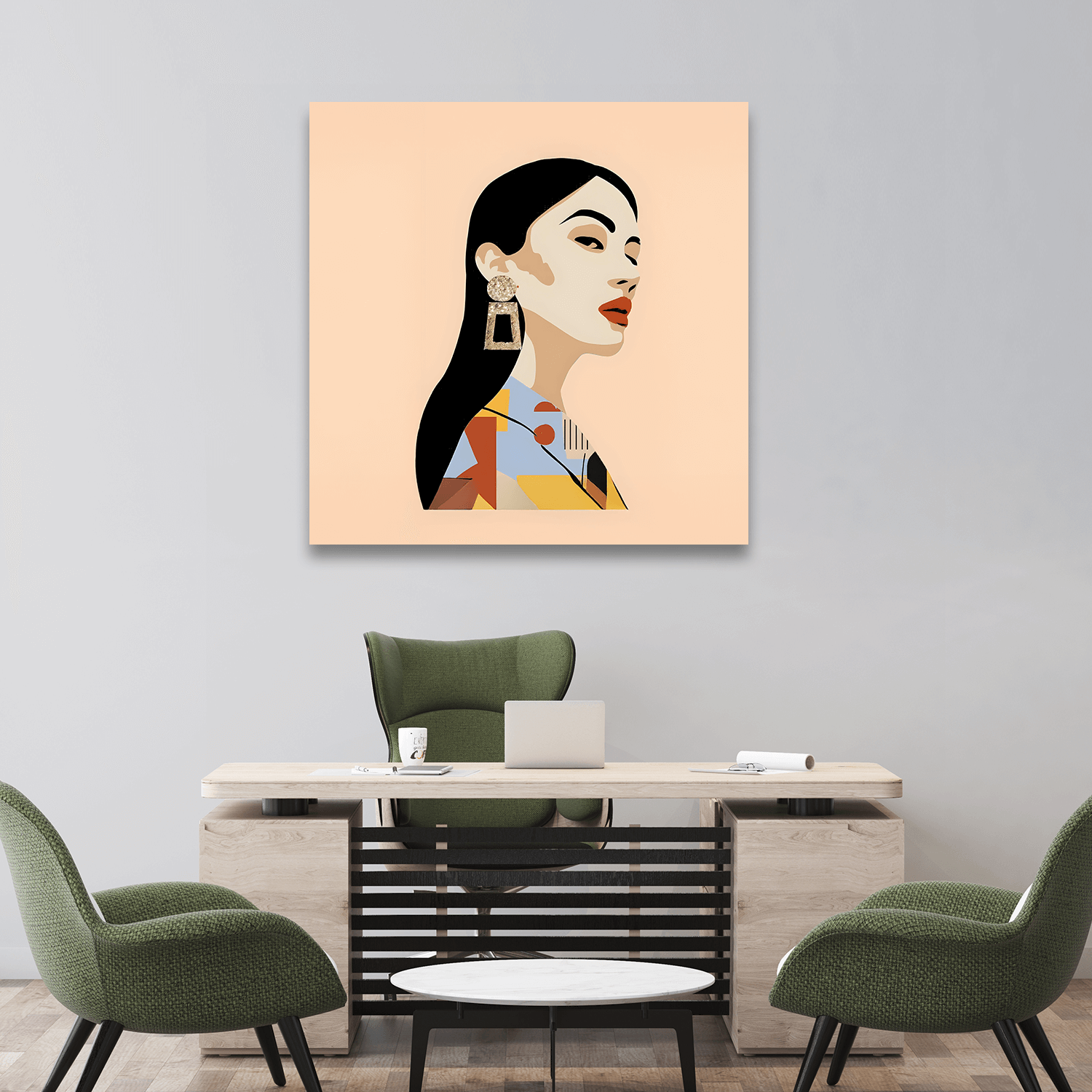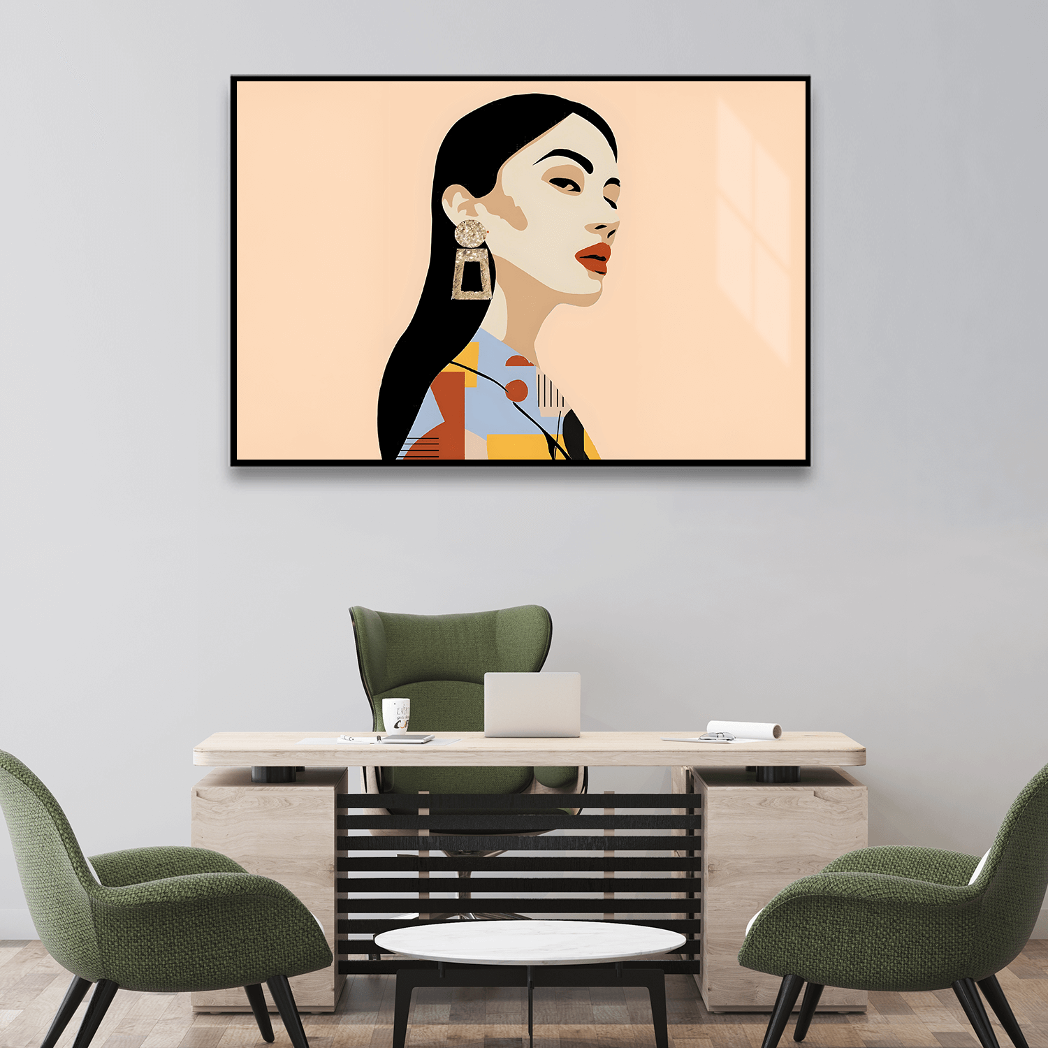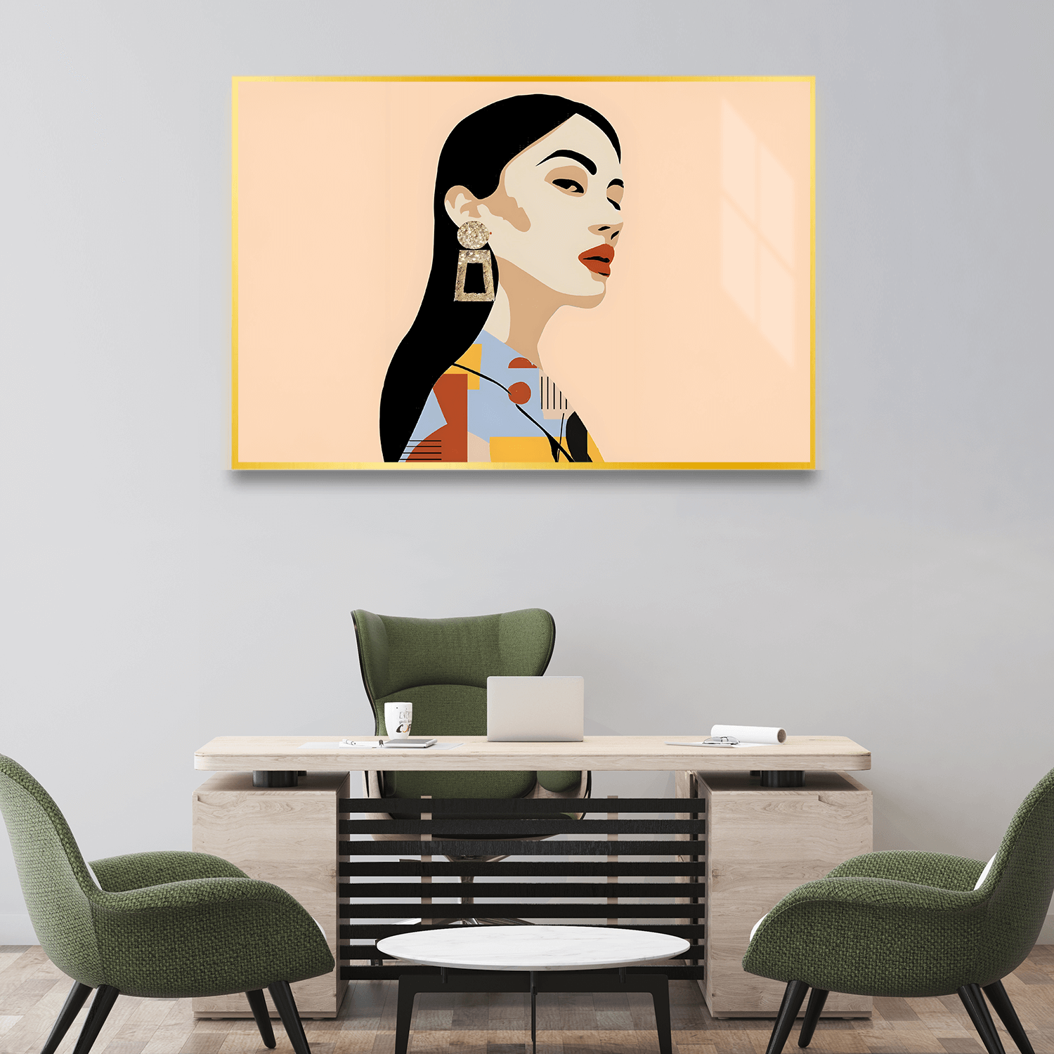 Kadın figürünün zarif silueti, sıcak renk paletiyle birleşerek odanıza sofistike bir hava katar. Salon tablosu olarak sergilendiğinde, misafirlerinizin ilgisini çeken bir odak noktası olur. Ofis tabloları kategorisinde ise, çalışma alanınıza sanatsal bir dokunuş ekler ve motivasyonunuzu artırır. Yatak odası tablosu olarak tercih edildiğinde, odanıza huzur ve zarafet katar.