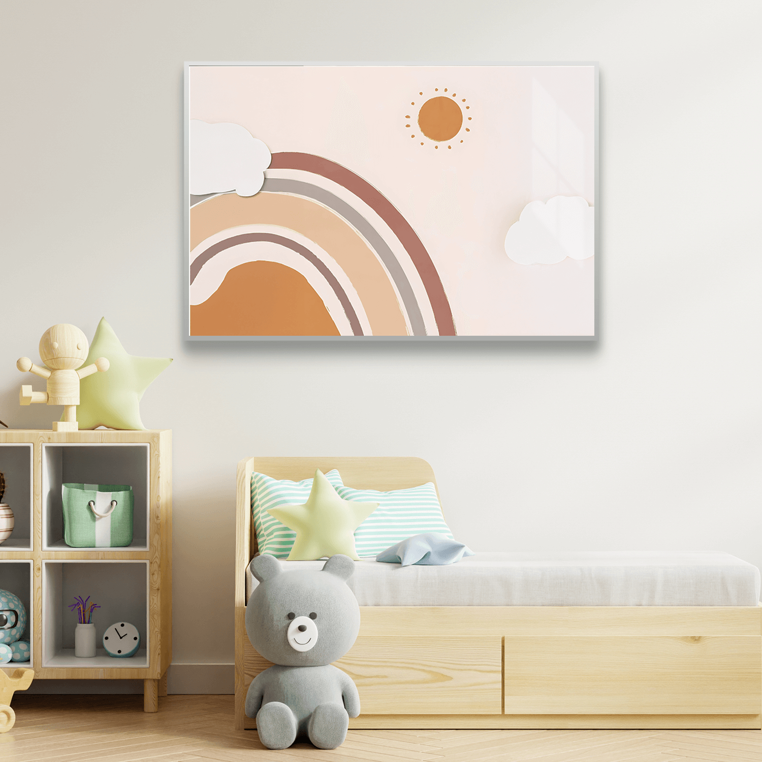 Sade Güneş ve Gökkuşağı Tablosu, pastel tonları ve minimalist tasarımı ile her yaşa hitap eden huzur verici bir dekorasyon unsurudur. Güneşin sıcaklığı ve gökkuşağının yumuşak renkleri, bulunduğu ortama dinginlik ve şıklık katar.