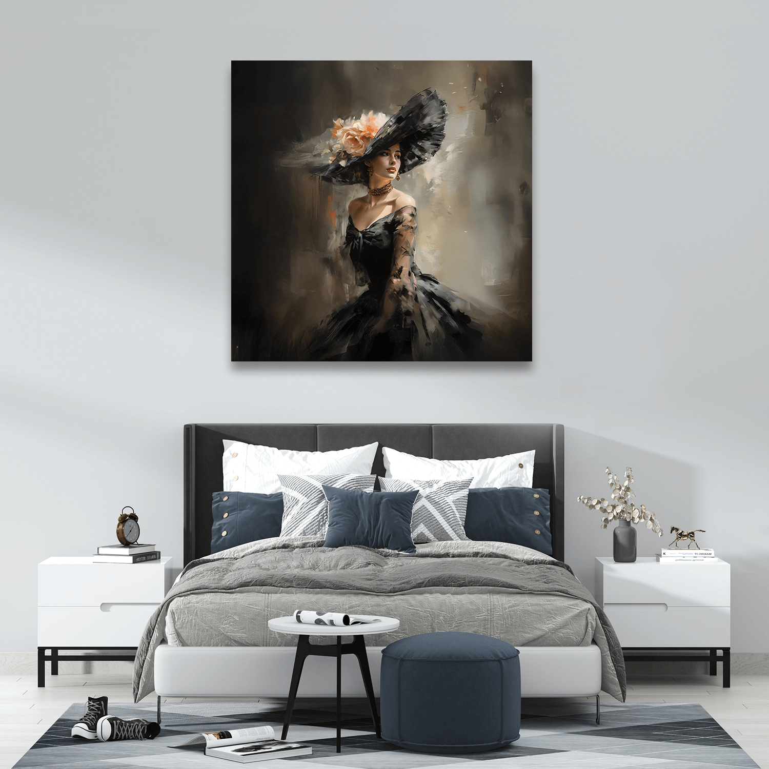 “Şapkanın Ardındaki Kadın”, görünmeyeni yücelten anlatımıyla duvar dekorasyonu için gizem ve zarafet temalı tablolar arasında özgün bir atmosfer yaratır.