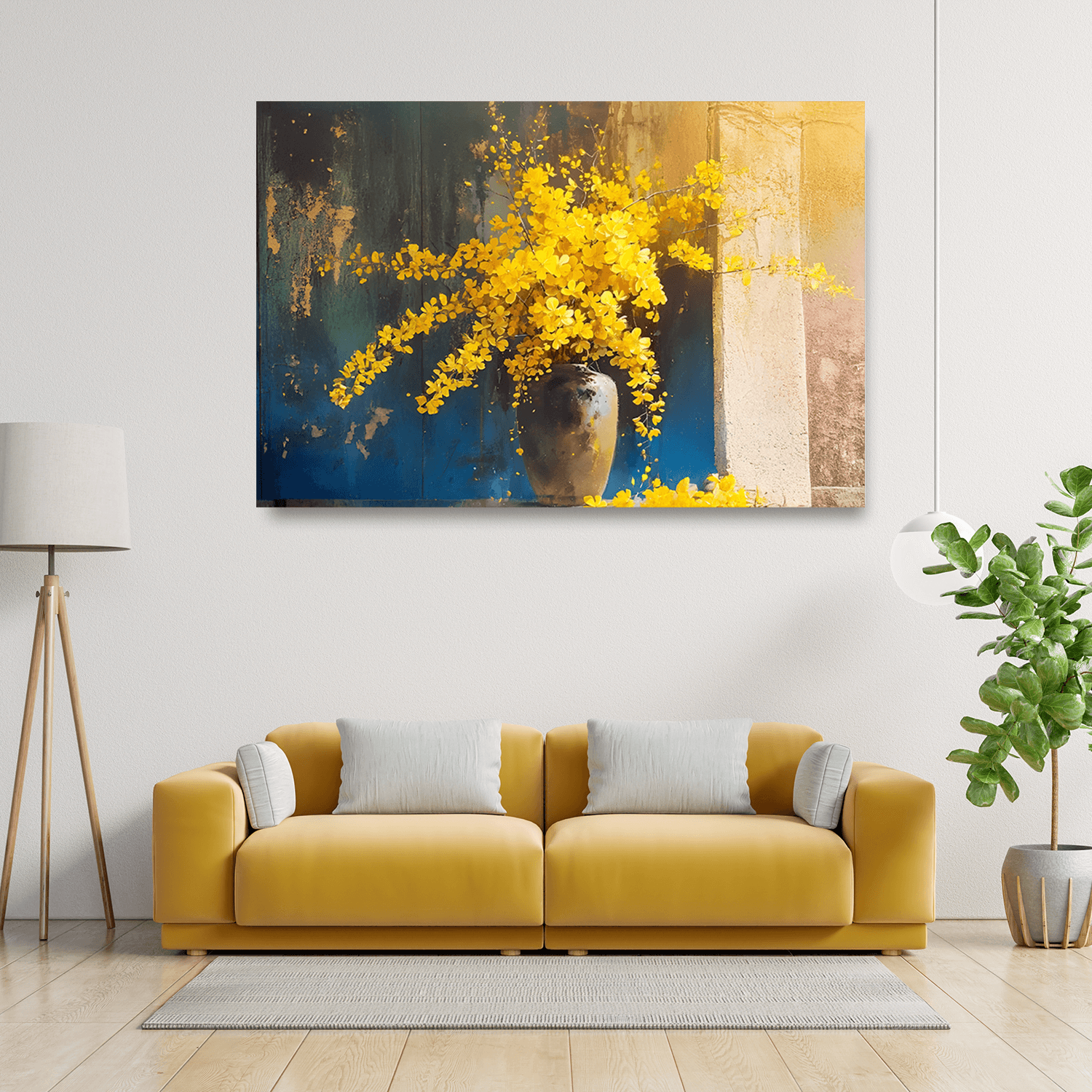 Vazodaki sarı çiçekler, bu tabloyu çiçek odaklı tablolar arasında hem geleneksel hem modern bir tarz arayanlara hitap eden zarif bir seçenek hâline getirir.