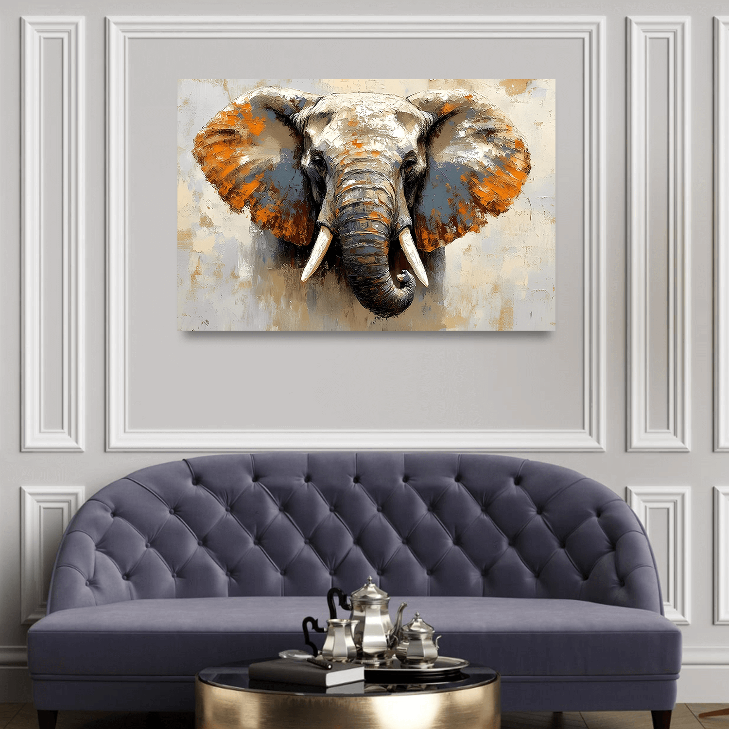 Filin karakteristik detaylarıyla işlenmiş bu eser, sanatsal fil tabloları koleksiyonunda mistik ve etkileyici bir dekorasyon seçeneği sunuyor.