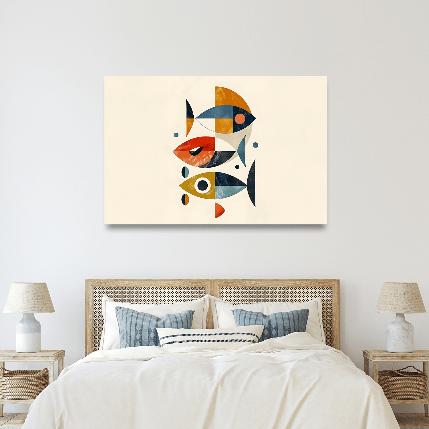 Balık figürlerinin soyut bir anlatımla işlendiği bu eser, hayvan figürlü duvar tabloları koleksiyonunda doğayı ve sanatı bir araya getiren şık bir seçenek sunuyor.