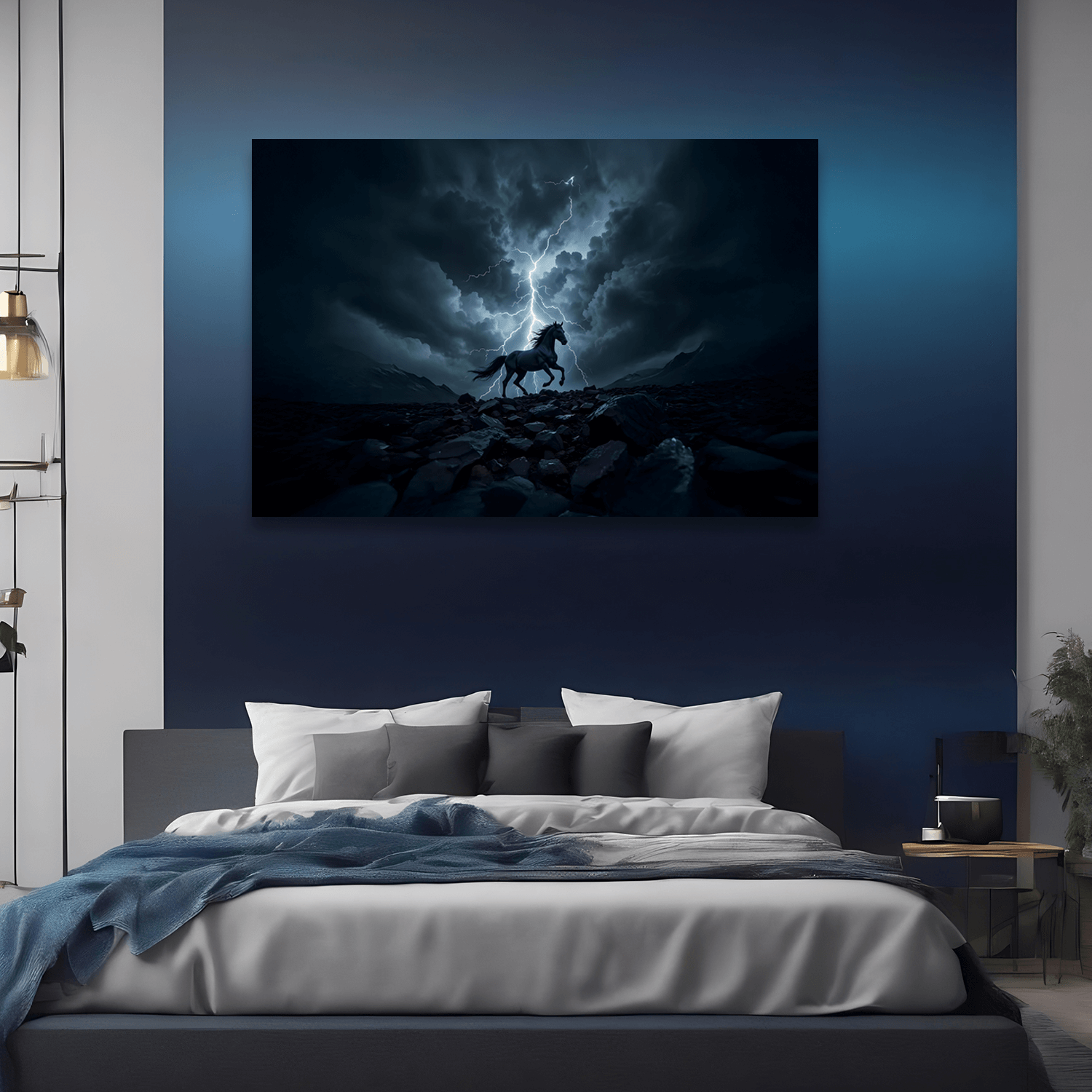 “Ateşin Gölgesi”, güçlü bir atın karanlık siluetini alev tonlarıyla buluşturan etkileyici bir tasarıma sahip. Bu eser, hayvan figürlü dekoratif tablolar koleksiyonunda doğanın enerjisini duvarlarınıza taşıyor.