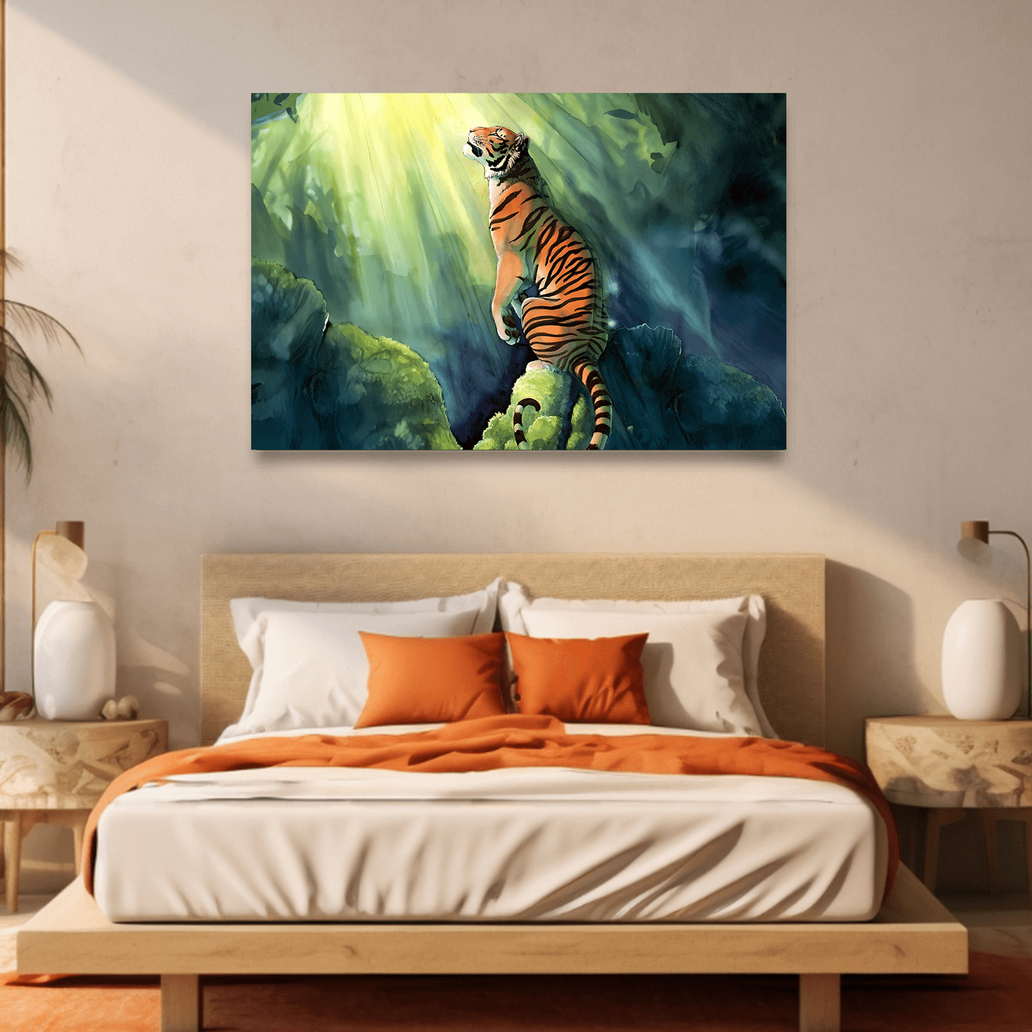 “Yırtıcının Meditatif Anı”, izleyiciyle doğrudan göz teması kurmak yerine, kendine dönük duruşuyla dikkat çeker. Bu yönüyle duvar dekorasyonu için içsel denge temalı tablolar arasında anlamlı bir seçimdir.